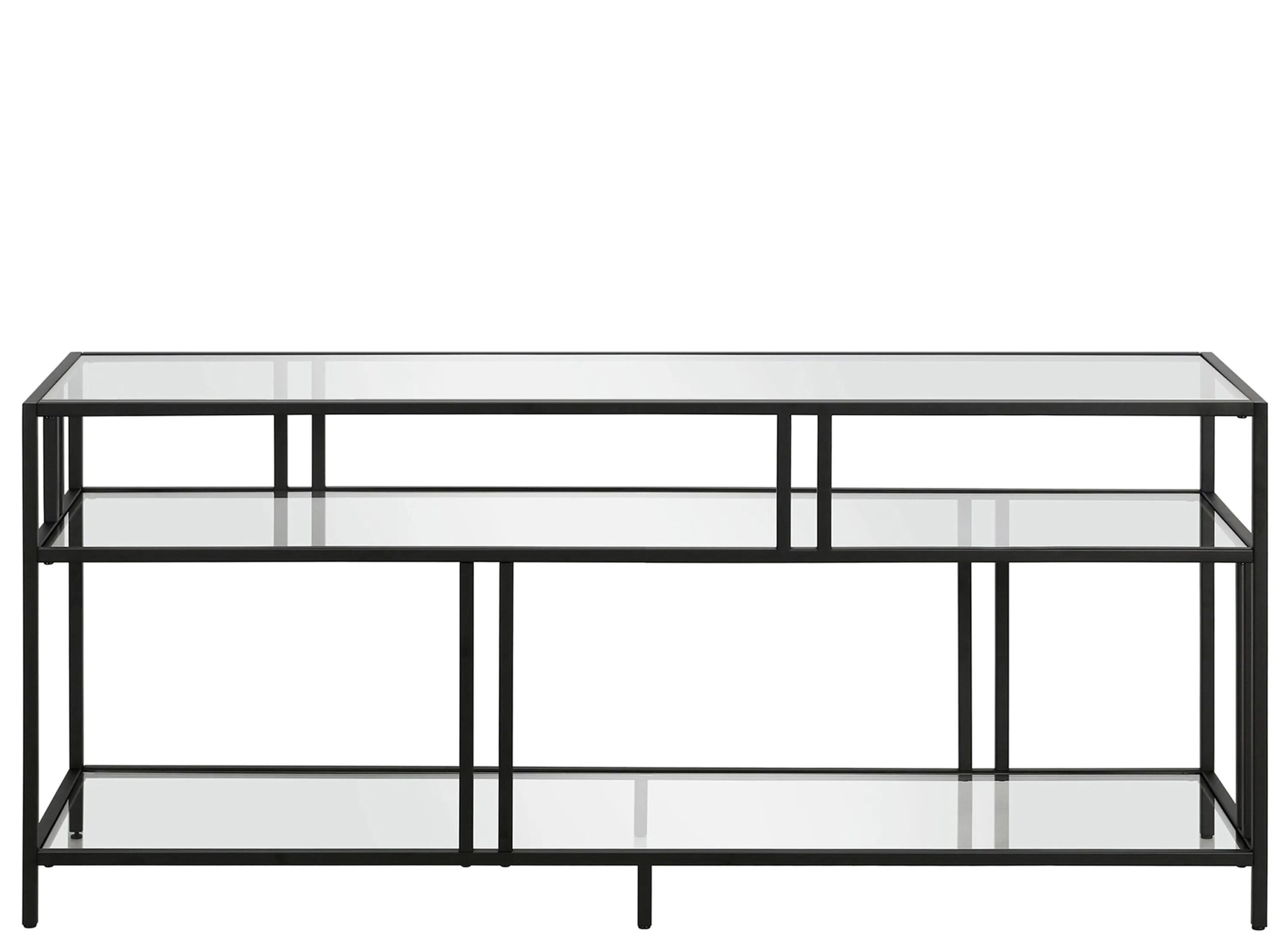 A strong linear profile sets this industrial-inspired TV stand apart. It’s double-barred accents offset the 3 tiers of durable glass shelving, creating an artful backdrop for your media collection or decorative items.