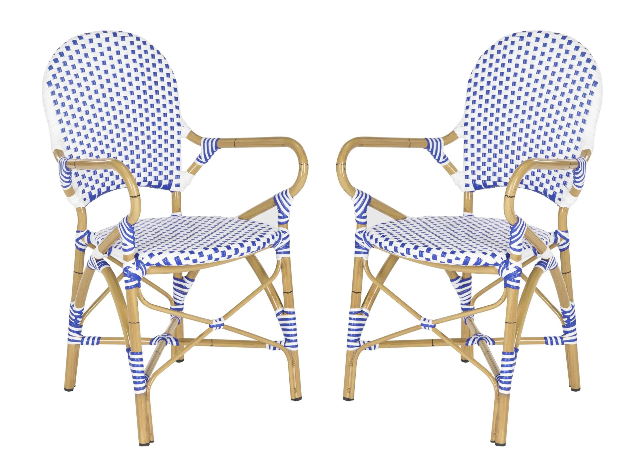 The Dario indoor outdoor stacking armchair by Safavieh in blue and white assumes a coastal cottage vibe. The cheerful woven PE wicker seat and back extends to pretty wrap detailing on the faux bamboo frame of this classically styled chair.