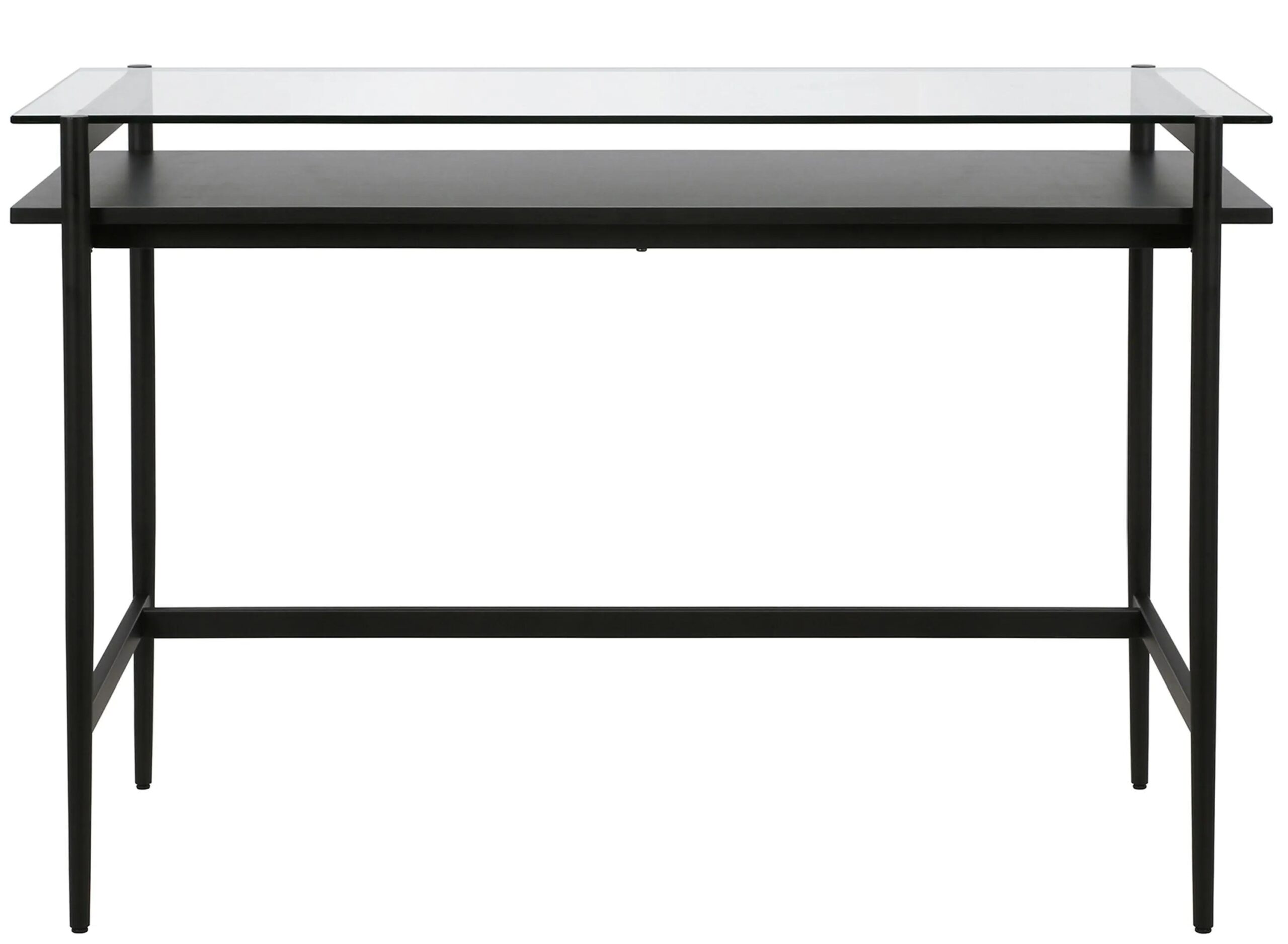 Work from home in mid-century style with this modern Davisan writing desk. The sleek lines of its steel frame are offset by a sturdy tempered glass top, allowing you a clear view to the wood-grained shelf below.