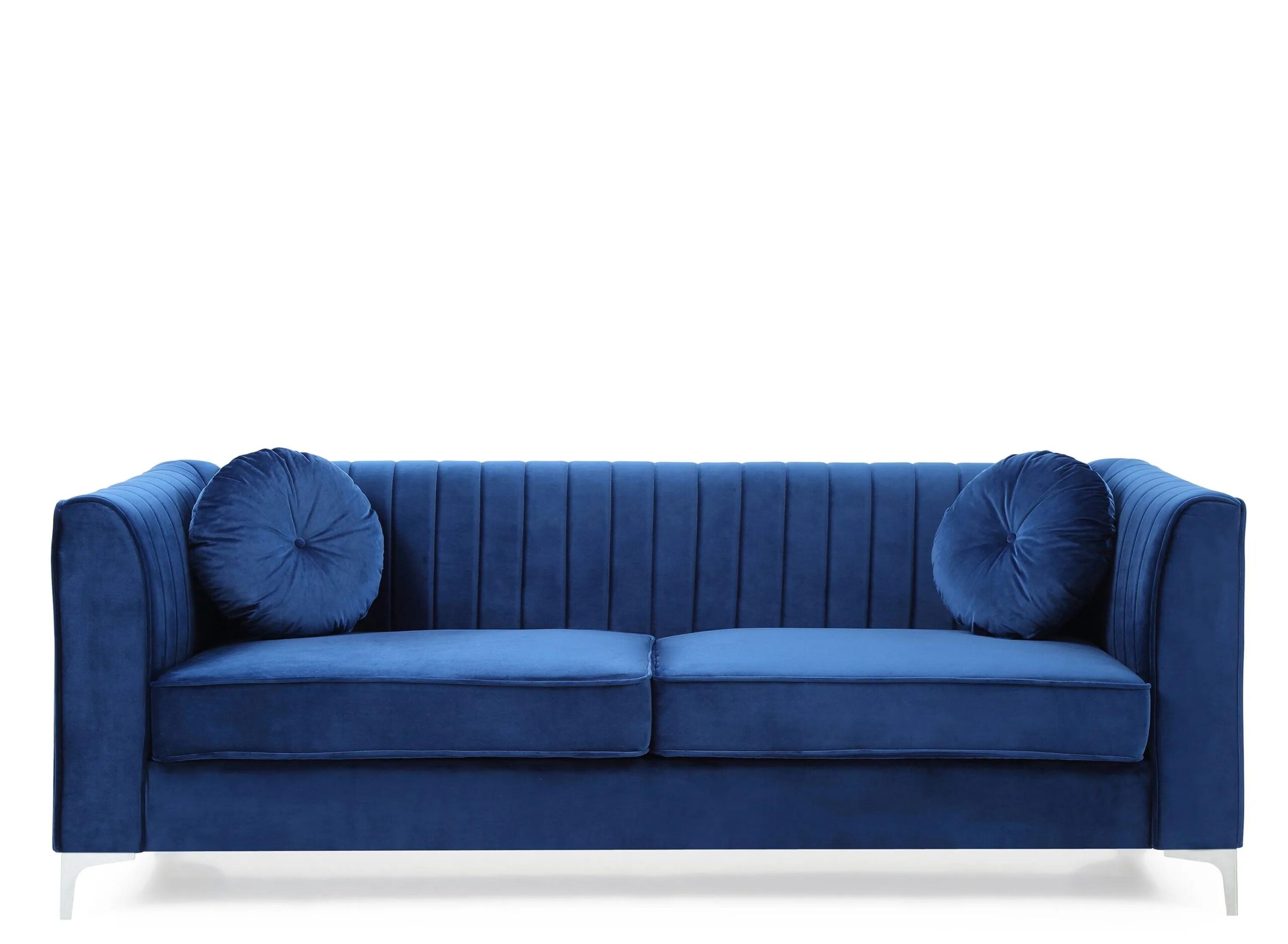 Soft polyester upholstery covers this dramatic Delray sofa. Includes channel quilted inside back and arms, matching throw pillows. Pocketed coil springs are encased in high quality support foam.