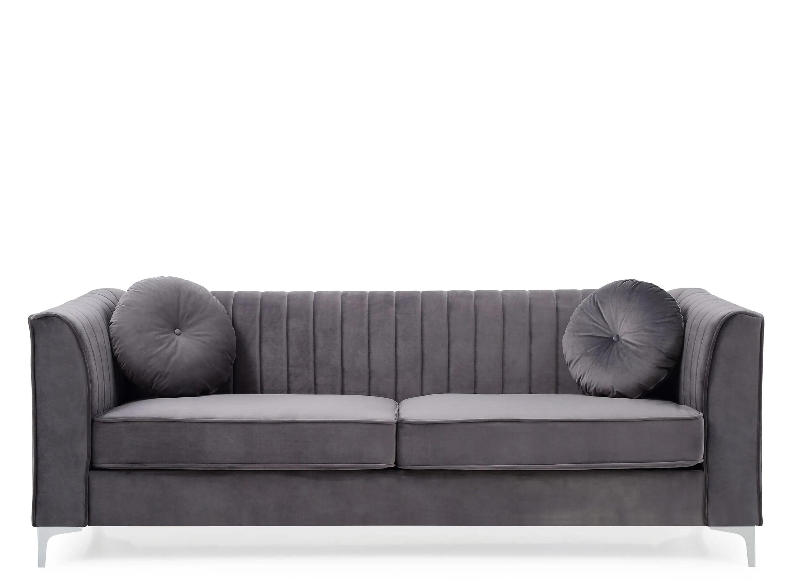 Soft polyester upholstery covers this dramatic Delray sofa. Includes channel quilted inside back and arms, matching throw pillows. Pocketed coil springs are encased in high quality support foam.