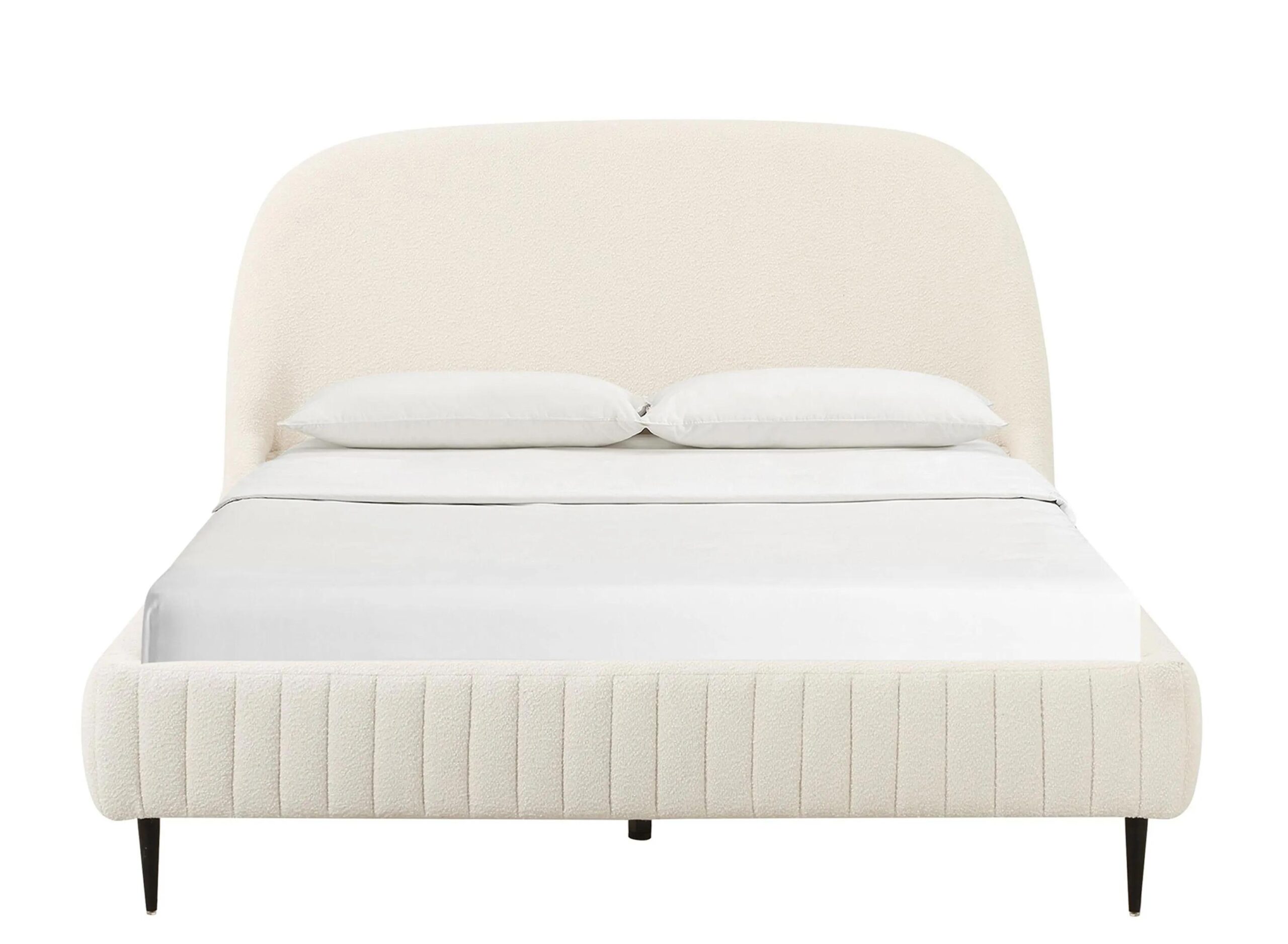 Upgrade your bedroom with the Denise Bed with the perfect blend of cozy boucle fabric, channel tufting, and black iron legs. Supported with a wood frame and the iron legs, this frame offers great strength and stability.
