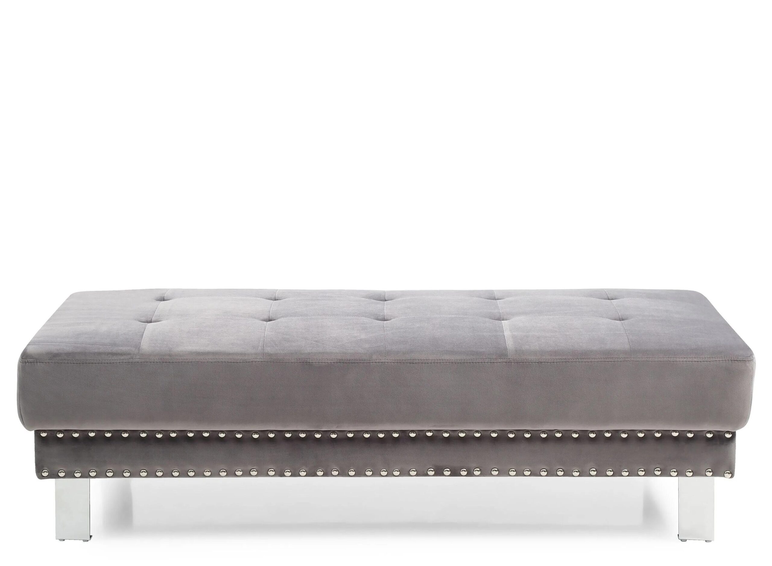 The Derek oversize tufted ottoman is covered in luxurious soft velvet can seat up to 2 people. High Density Foam as well as Springs are used for additonal support and comfort. Chrome nailheads and legs are included to finish off this Modern Look.