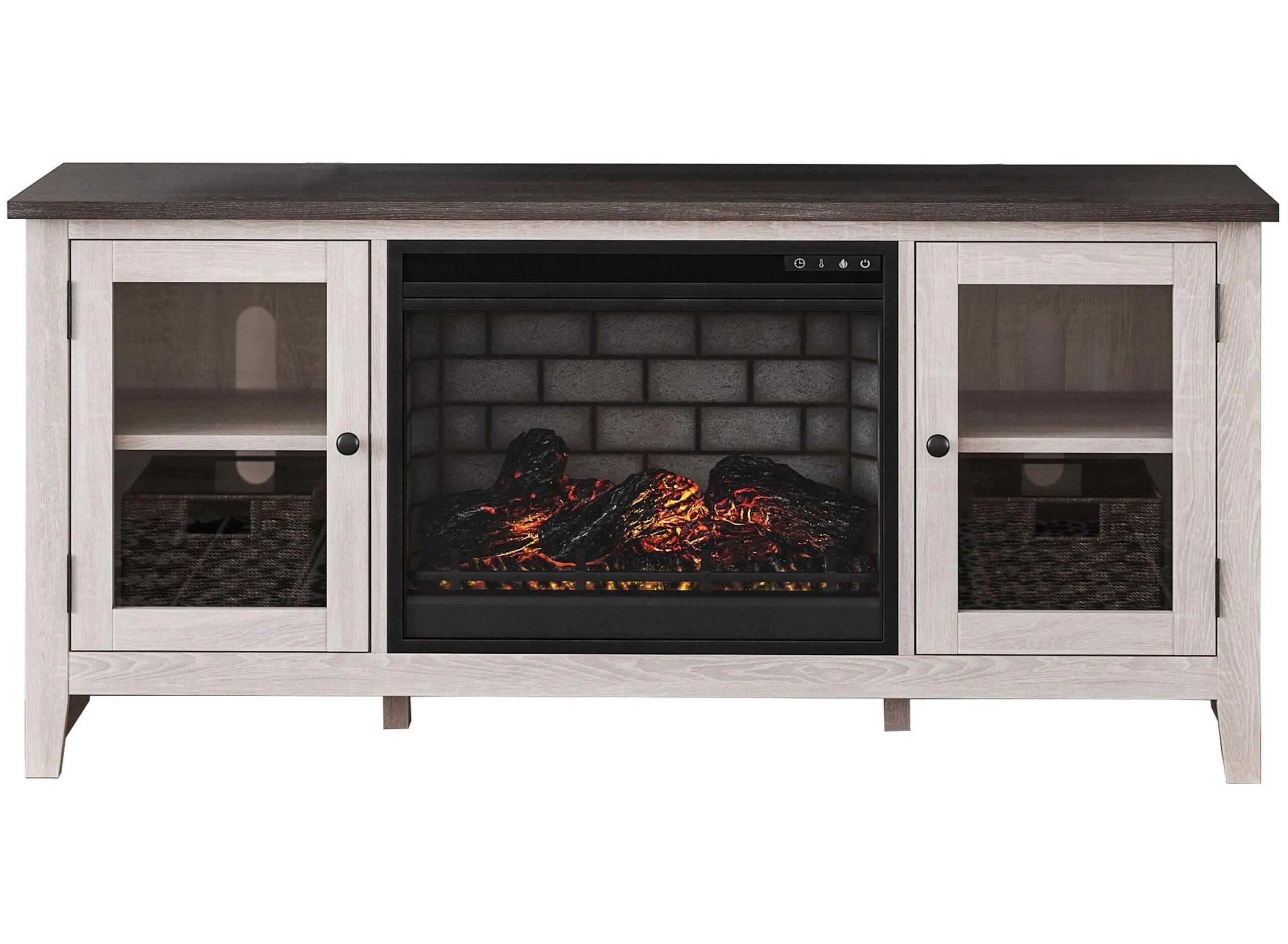 With its two-tone finish and minimalist charm, the Dorrinson TV Stand and Electric Fireplace is right in tune with your relaxed approach to high style. Beautifully made to accommodate your media equipment, its well equipped with adjustable shelving, cutouts for wire management and a pair of glass
