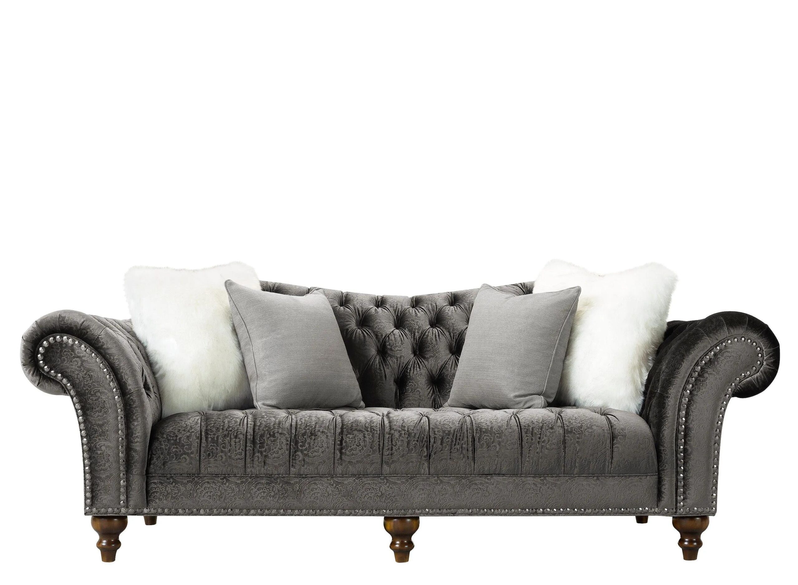 The Duchess sofa’s name is quite befitting, since this lavish piece radiates opulence. Velvet-look upholstery provides indulgent comfort, and the subtle gray-on-gray pattern offers plenty of allure.