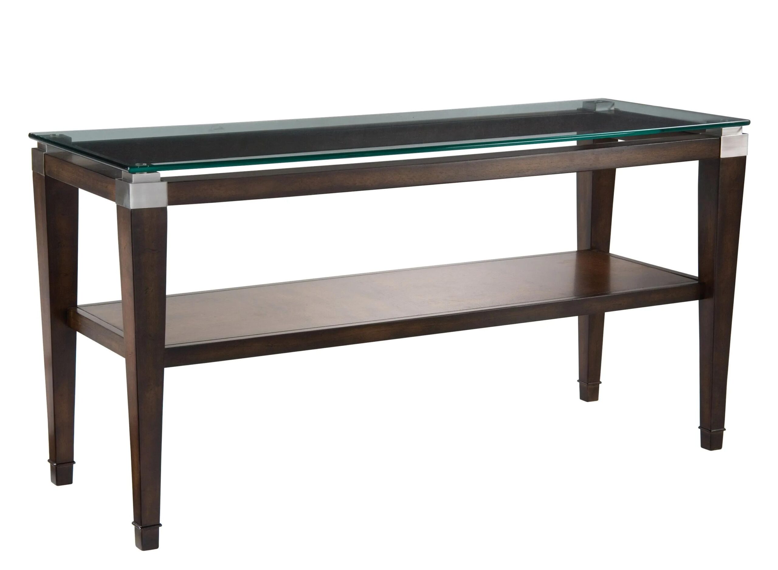 A unique console table can really draw in the personality of a room, and this Dunhill glass console table will give your living room the touch of character it needs. Its warm walnut finish is accentuated by a 1/2 in.