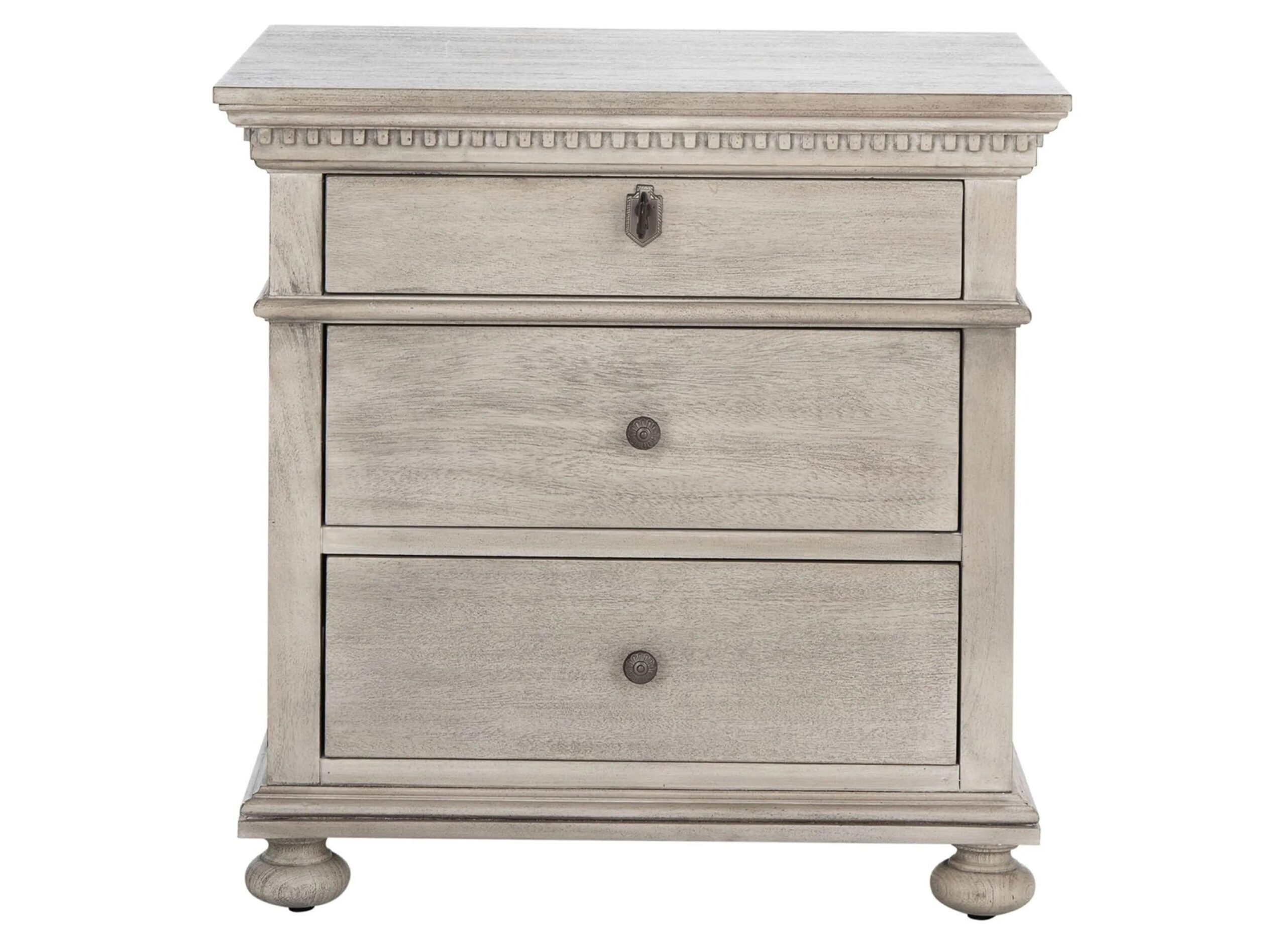 Styled after the one-of-a-kind antique furnishings in regal estates, this Edna Nightstand abounds with aristocratic allure. Edna’s finely carved details and traditional bun feet are beautifully displayed in light grey mahogany, while antiqued silver knobs complete the stately look.
