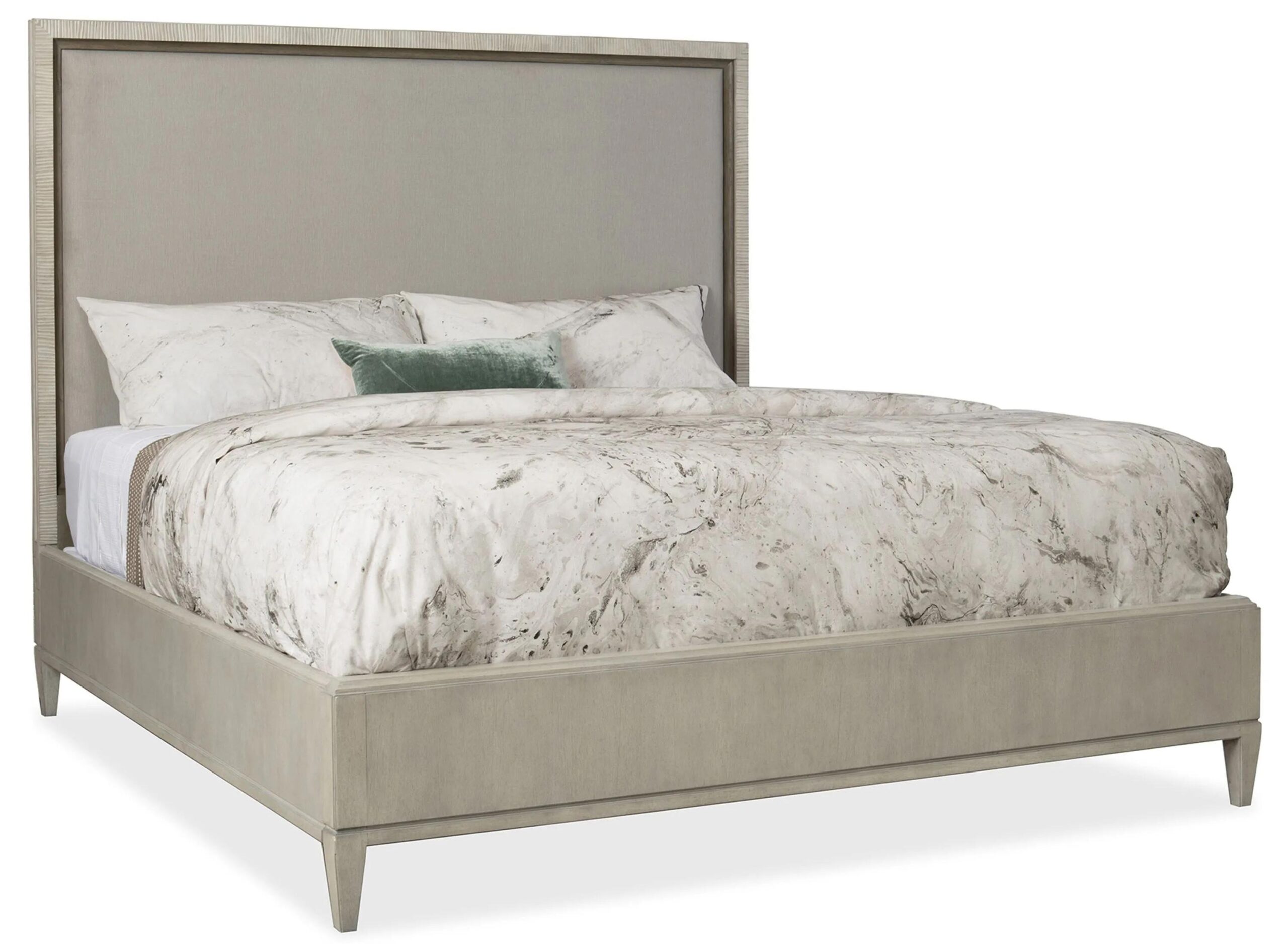 Create a serene refuge in your bedroom with the Elixir King Upholstered Bed that exudes a feeling of comfort and simplicity. The headboard is upholstered in a soft, neutral texture, with the border, footboard and rails finished in a gray-beige finish applied to lightly sand-blasted walnut veneer
