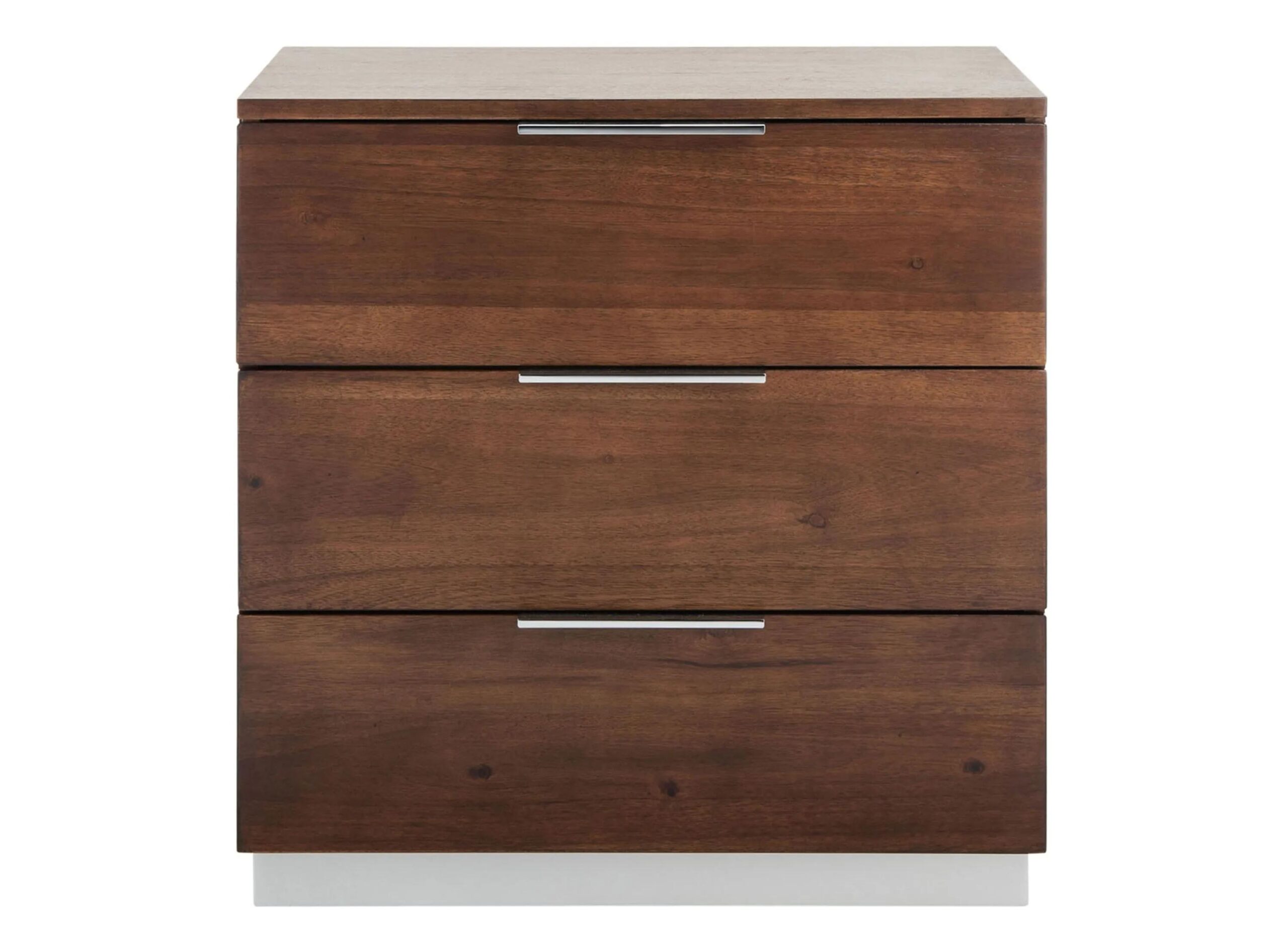 A stylish study in artistic contrasts, this Eva 3 Drawer Nightstand is designed to showcase the best of rustic warmth and contemporary chic. Eva’s dark walnut finish beautifully juxtapose with its chrome-plated metal pulls and plinth, making for a versatile look that’s always in vogue