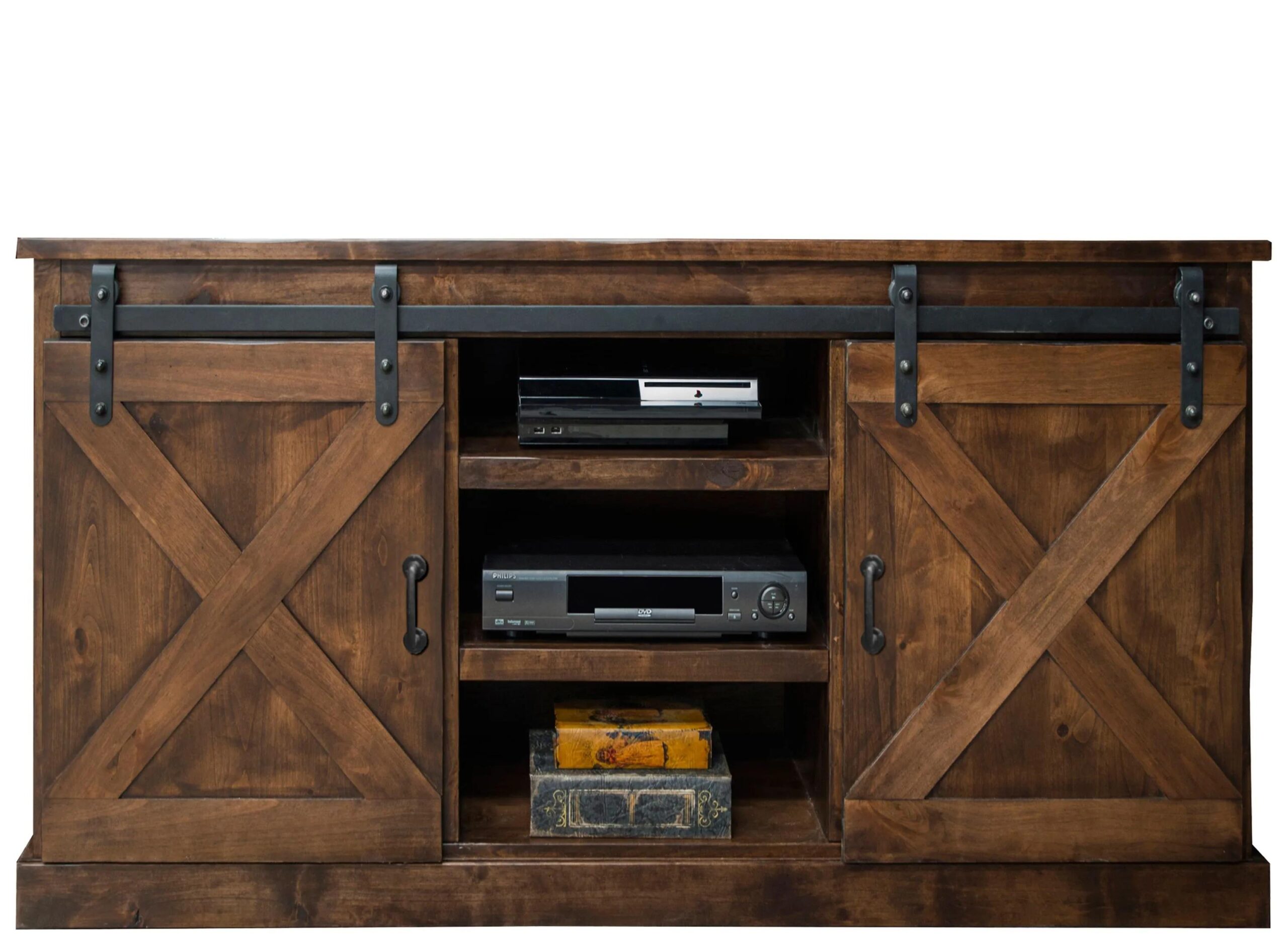 Bring “The Look” home today with the Farmhouse 56″ Corner TV Console. Its wildly popular warehouse or barn style doors have become a staple in many homes across America. Reminiscent of simpler times, the appeal is understandable and undeniable.