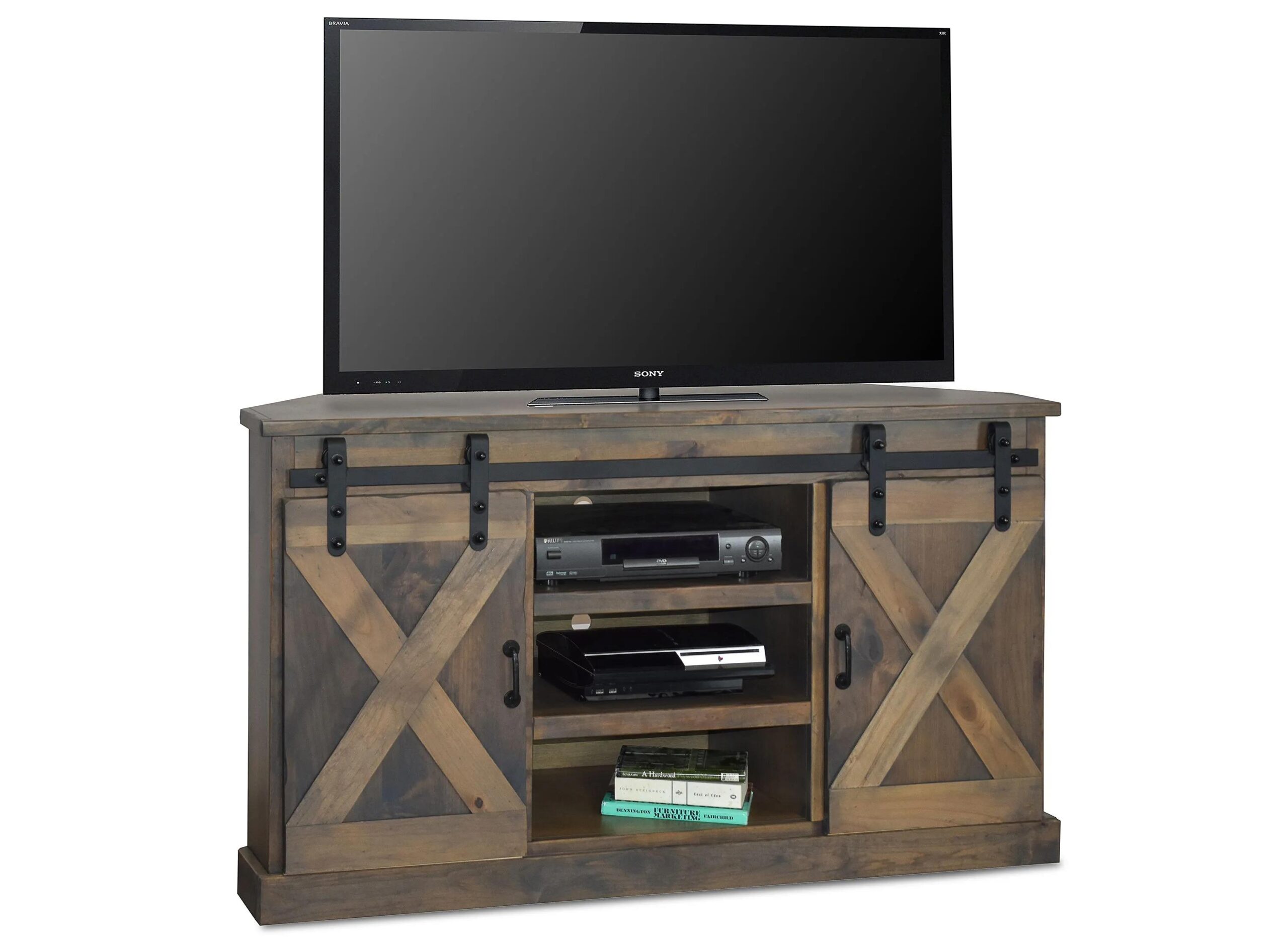 Bring “The Look” home today with the Farmhouse 66″ Corner TV Console. Its wildly popular warehouse or barn style doors have become a staple in many homes across America. Reminiscent of simpler times, the appeal is understandable and undeniable.