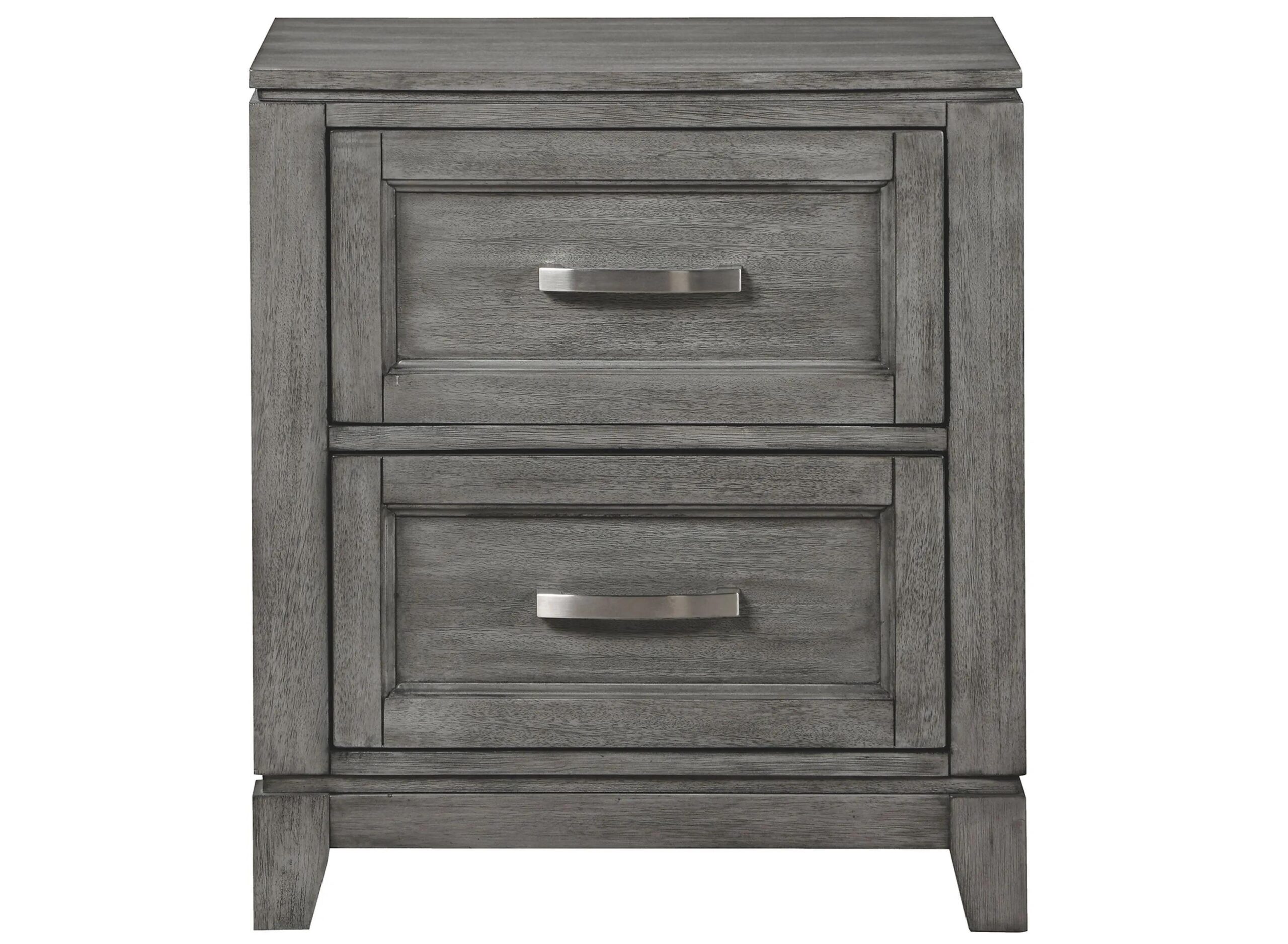 The Faustina Nightstand blends transitional lines with rustic styling to create an elegant addition for your bedroom. The distinct grain of the okume veneer features a gray finish. Metal bar hardware accents the picture frame drawer fronts of the nightstand.