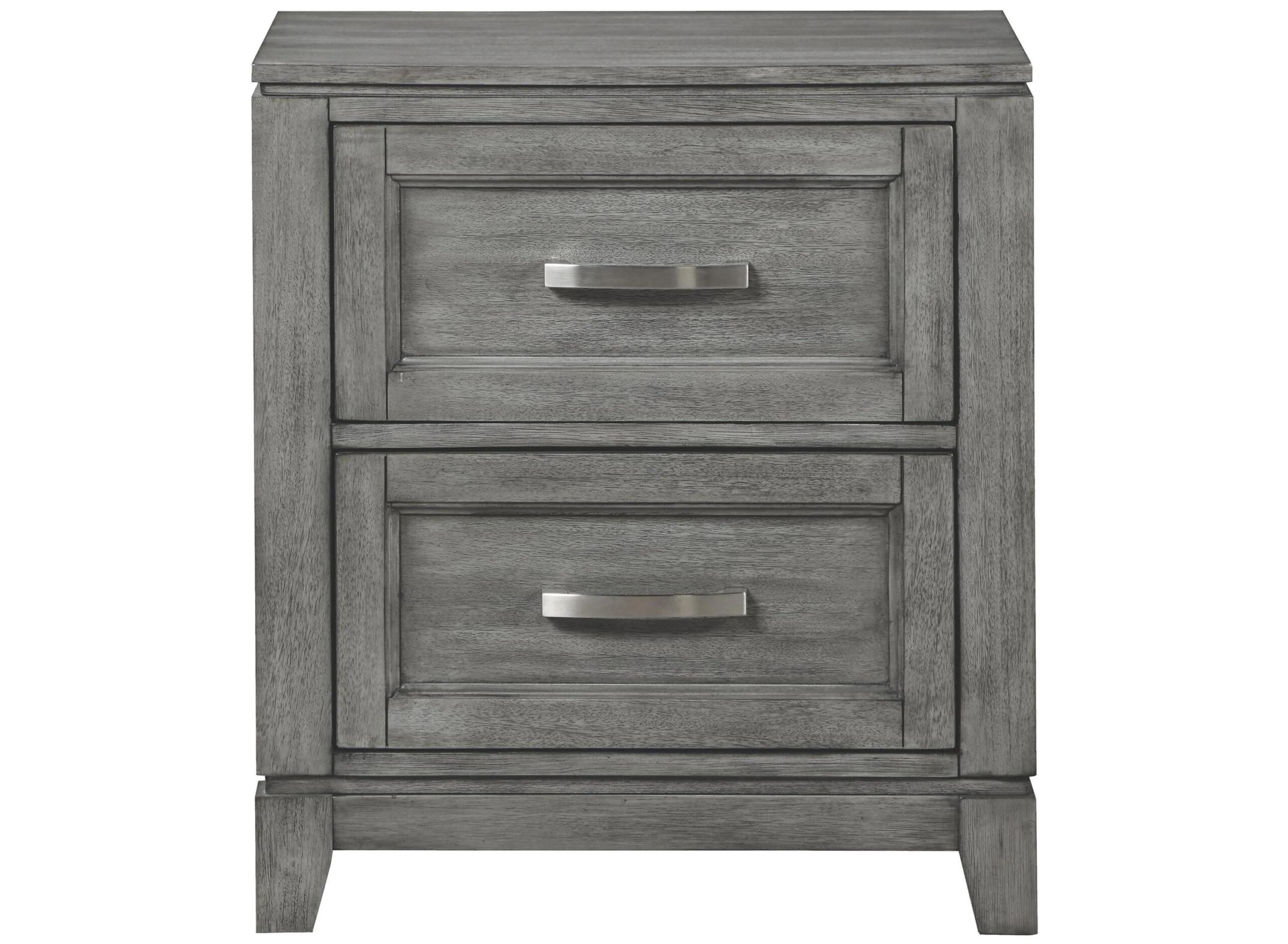 The Faustina Nightstand blends transitional lines with rustic styling to create an elegant addition for your bedroom. The distinct grain of the okume veneer features a gray finish. Metal bar hardware accents the picture frame drawer fronts of the nightstand.
