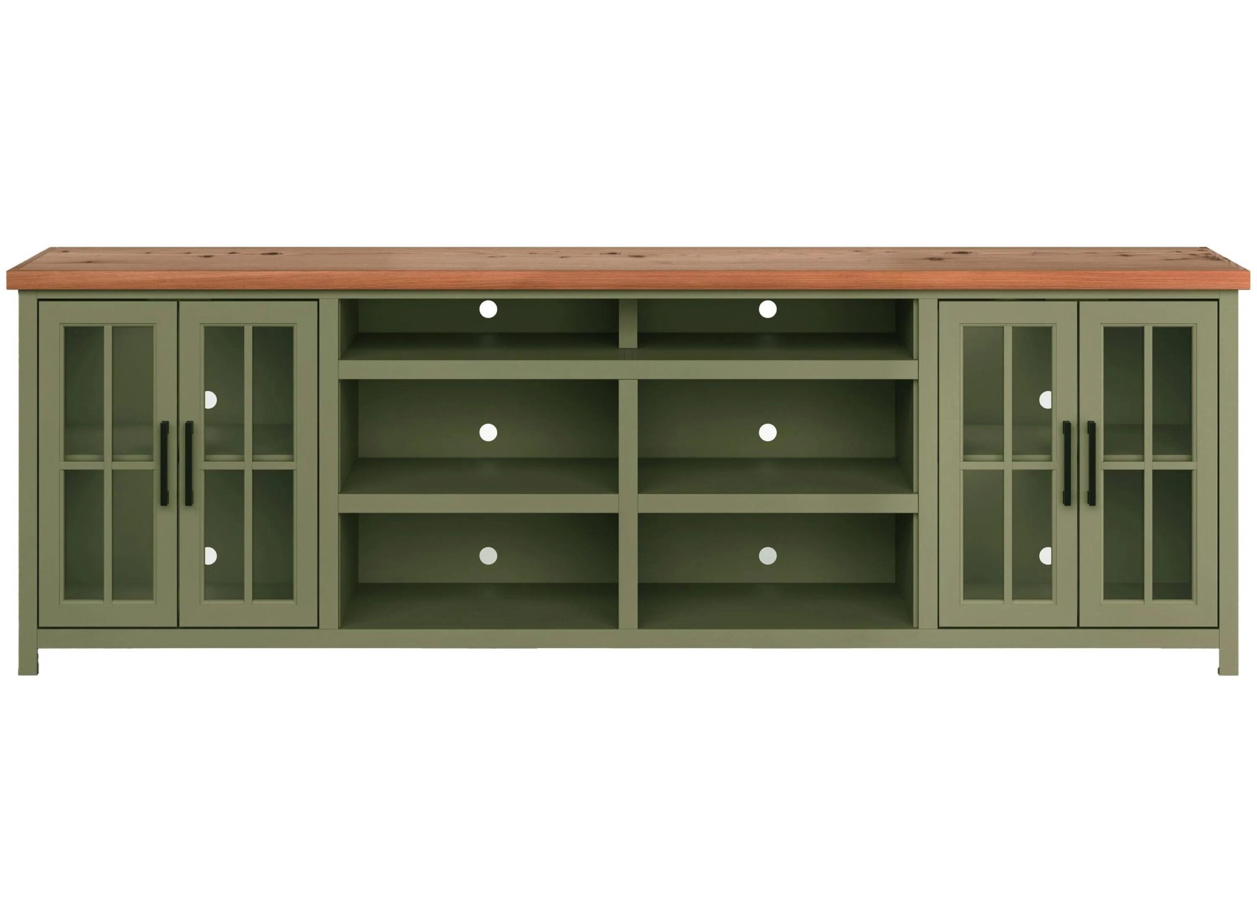 Your Foxgrove 97″ TV Console is dressed in an alluring, two-toned Sage Green with Fruitwood top, to create a refreshing, new look to any room. Holds up to an 100″ TV with plenty of room to store your media gear, while showing off your personal touch.
