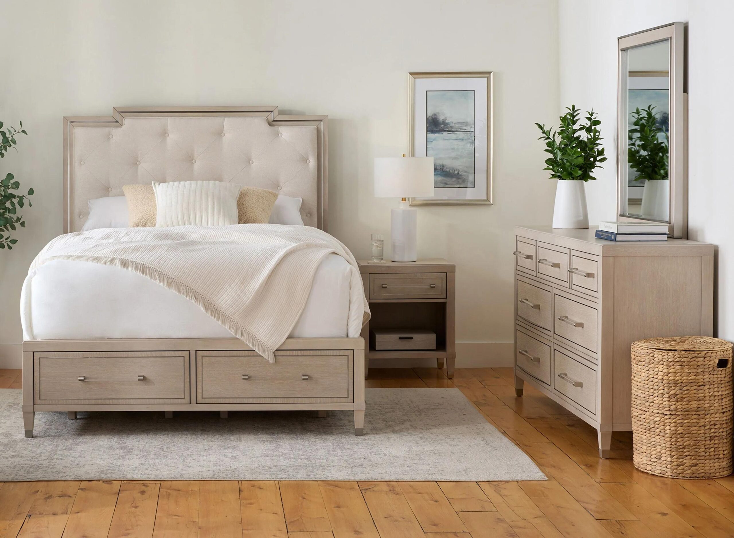 The beautifully crafted Francesca bedroom set features solid wood construction with a timeless light oak finish and tufted upholstered headboard for a casually elegant vibe. Elevate your bedroom and its storage capacity with a platform bed featuring 2 built-in drawers plus a graceful dresser with
