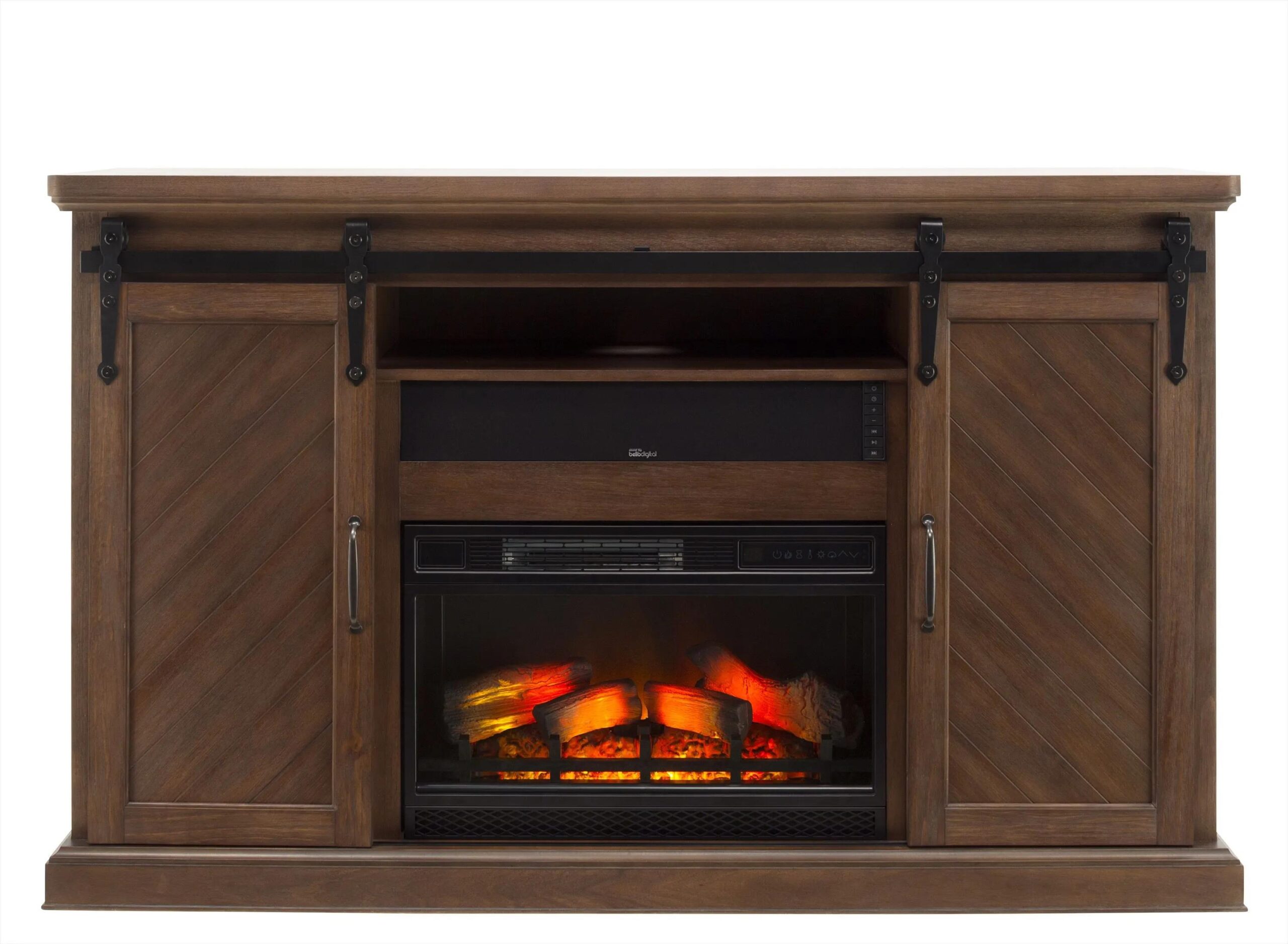 Let the Georgia 64″ TV console with firebox set the mood in your living room space. Sliding barn style doors open to reveal a fireplace and speaker; both great for a relaxing night in or entertaining guests.