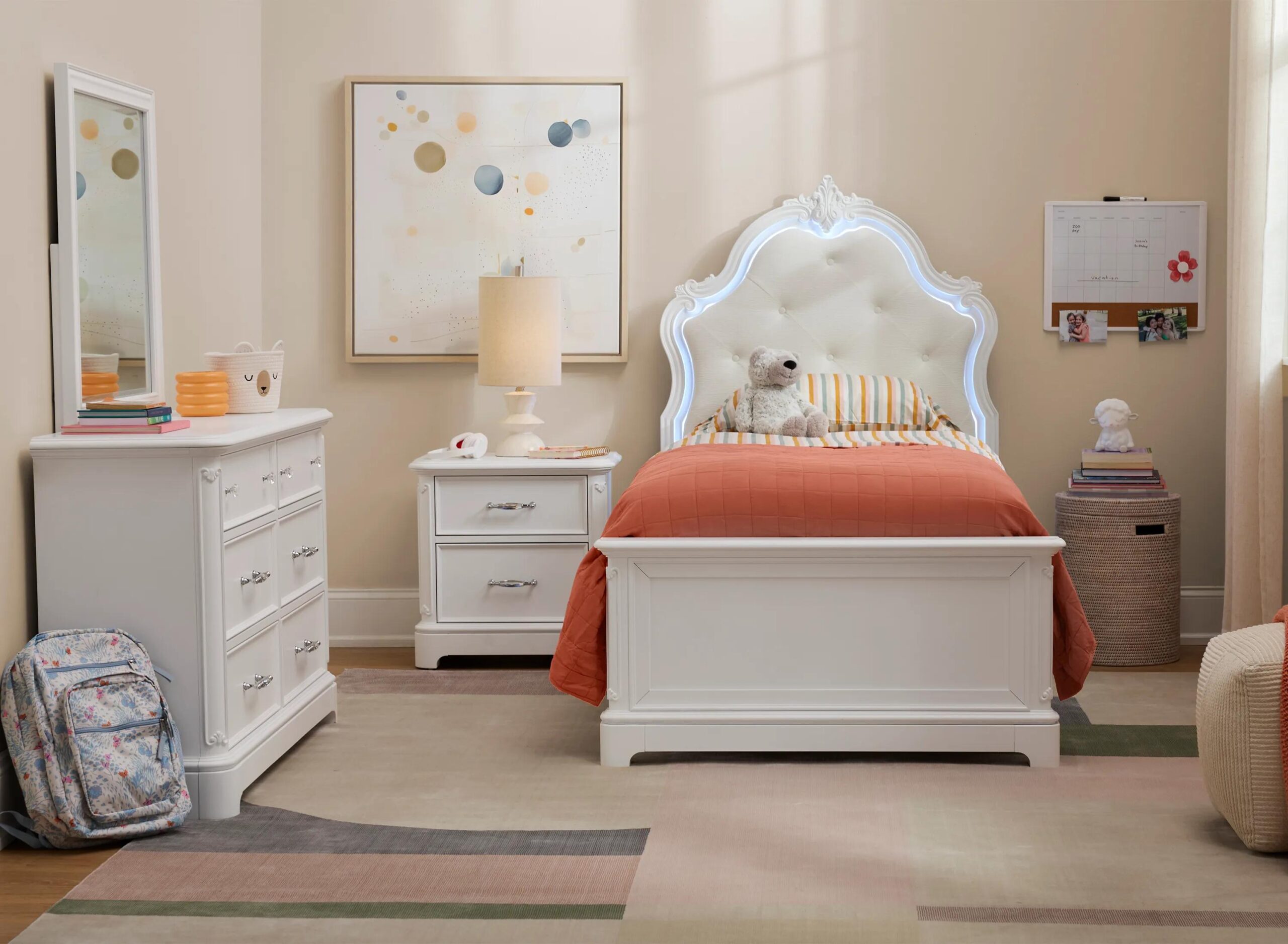 Fit for fairy tales and sweet dreams, the enchanting Gianna bedroom collection makes every night feel special. The tufted, upholstered headboard is beautifully detailed with graceful carving worthy of a princess, while multi-color touch lighting creates a delightful glow with color options.
