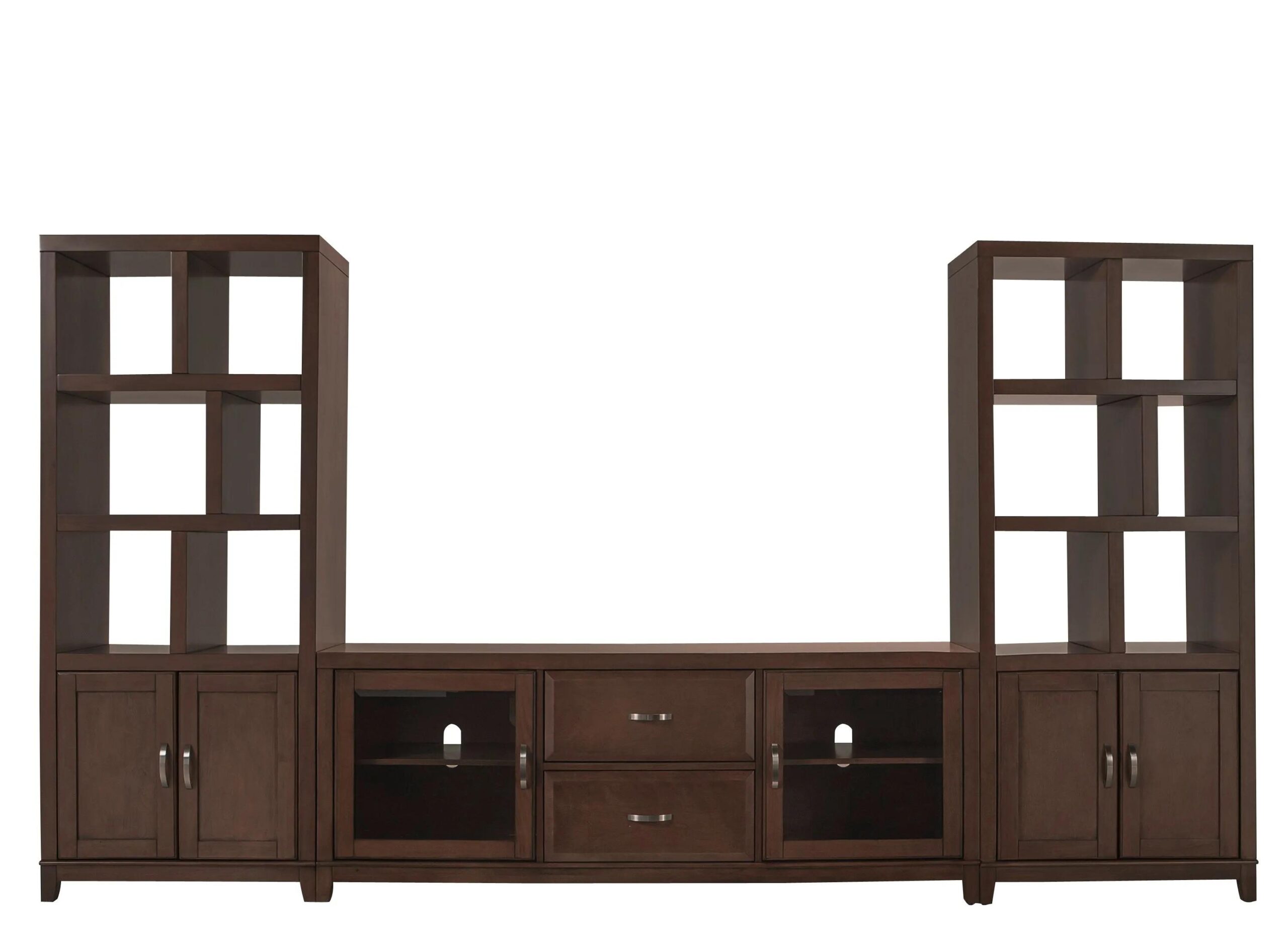 Divide and conquer with the Granthom 3-pc. wall unit crafted of solid poplar with birch veneers. The 72″ TV console and pair of towers enable you to customize your entertainment space. Wood-framed glass doors and see-through compartments add to the visual transparency of this flexible wall