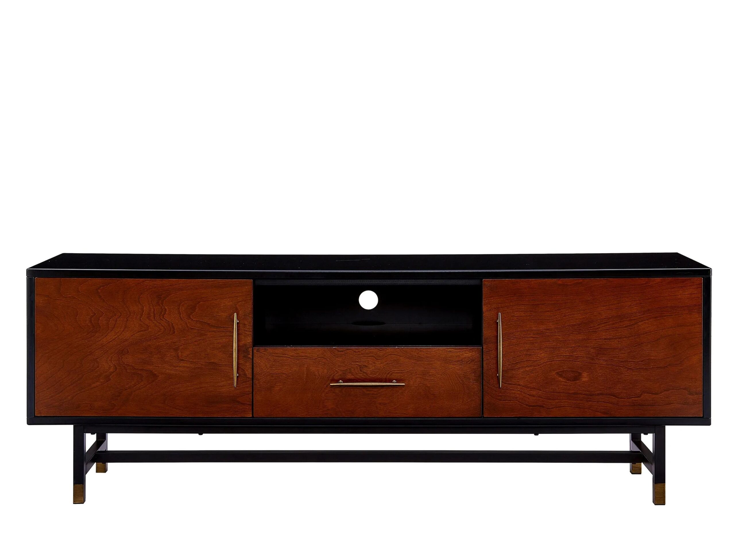 Unbox sleek style with this Halstead Blynn Tv/Media Stand. Black frame encases whiskey maple cabinet storage for everything from media equipment to entertaining accessories. Cord outlets keep wires out of sight and out of mind, while the spacious buffet-style top displays your keepsake treasures