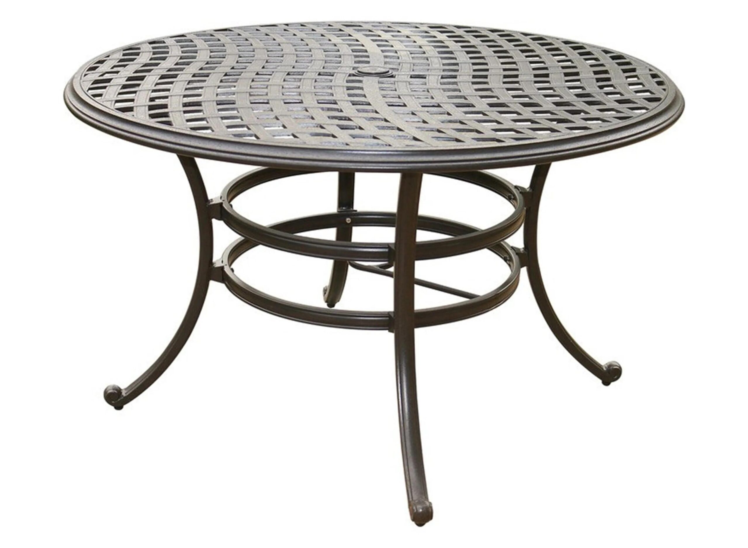 Discover open-air serenity with the Halston outdoor round dining table. The highly detailed double lattice design offers a casual elegance to any outdoor decor. Features a tough, powder coated finish that is weather resistant.