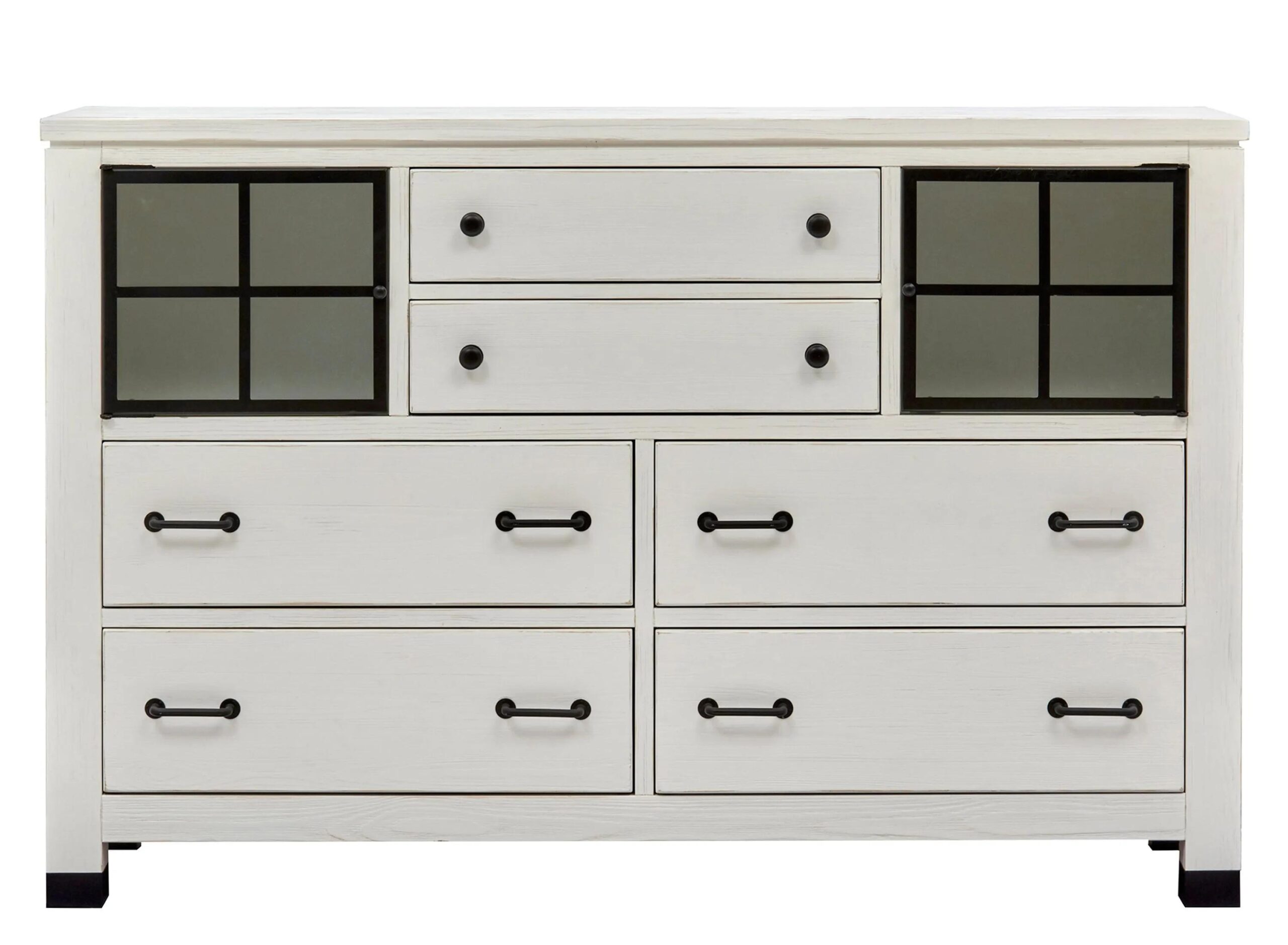 Farmhouse fresh meets industrial chic in the Harper Springs Dresser. Black metal ferrules, corner brackets and forged iron hardware bring an industrial modern vibe to the craftsmen-like silhouettes.