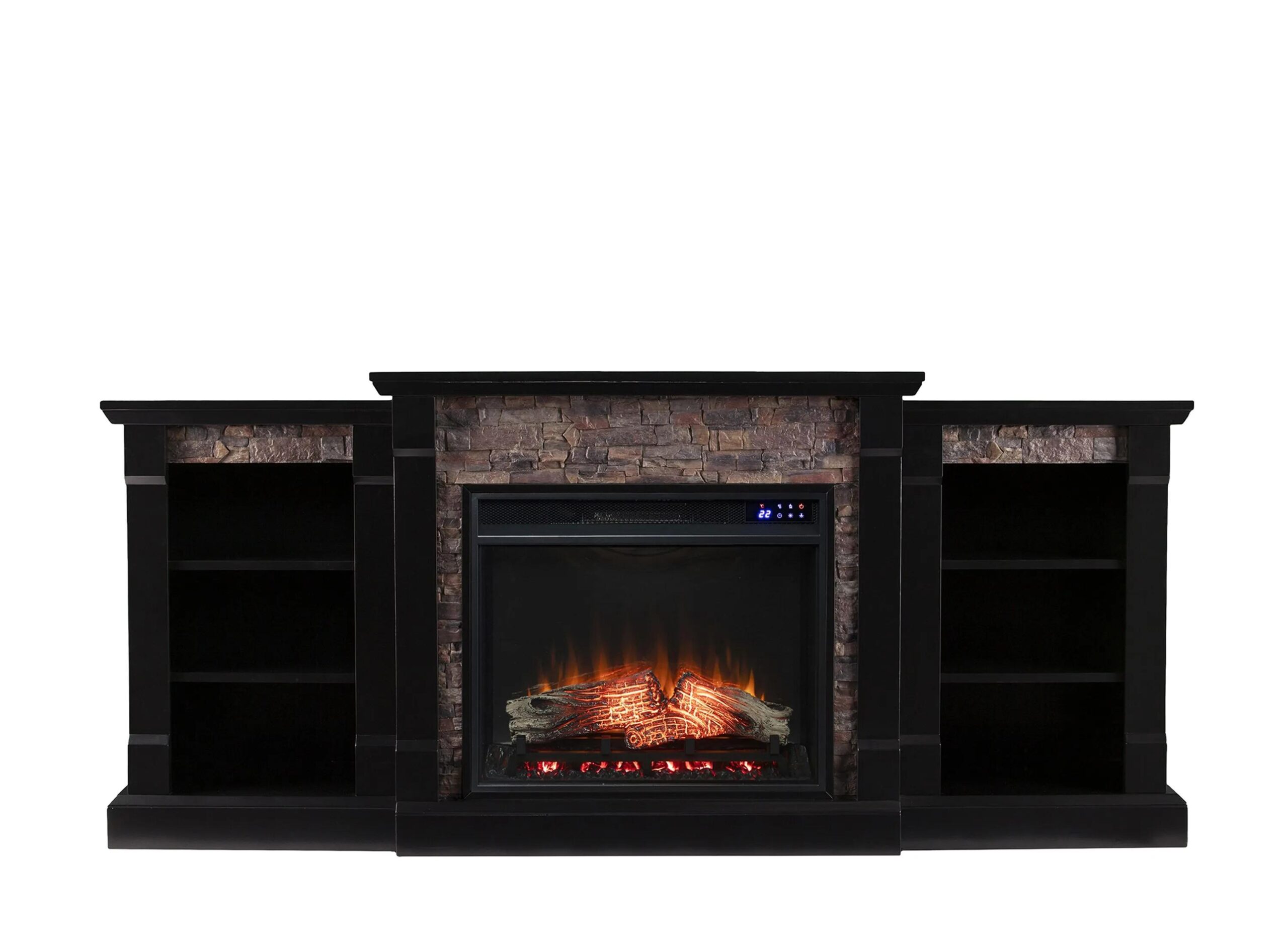 Set your heart aflame with this lodge-inspired Harrow Fireplace. Bookcase storage shelves media, novels, or trinkets. Satin black melds with simulated black river stone for a rustic touch on this traditional fireplace silhouette.