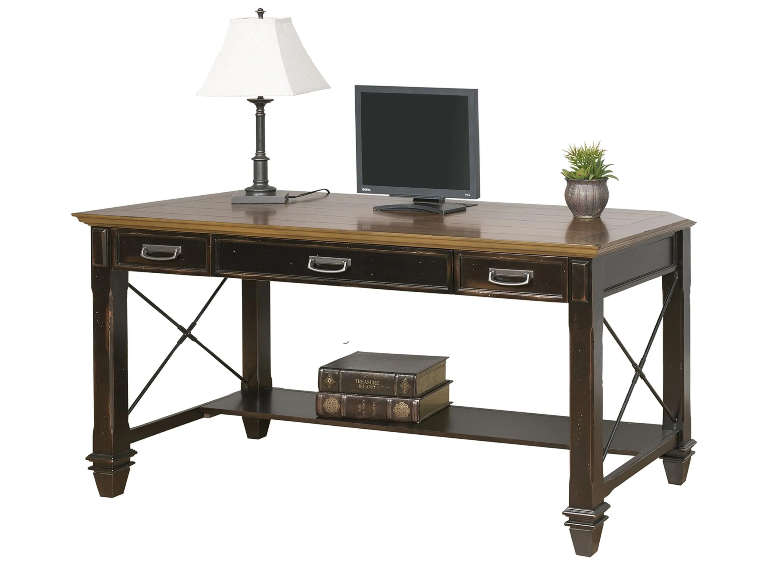 The Hartford writing desk offers a casual interpretation of classic style. This contract grade piece features a two-tone finish in contrasting colors. Metal accents and wire mesh detail add interest to the design.