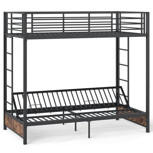 ● Twin over twin/futon bunk bed with space-saving vertical design● The lower bed can be converted from a twin size bed to a sofa by folding the frame● Powder-coated metal slats ensure sturdy construction and strong weight capacity● Equipped with 3 middle support legs for added stability