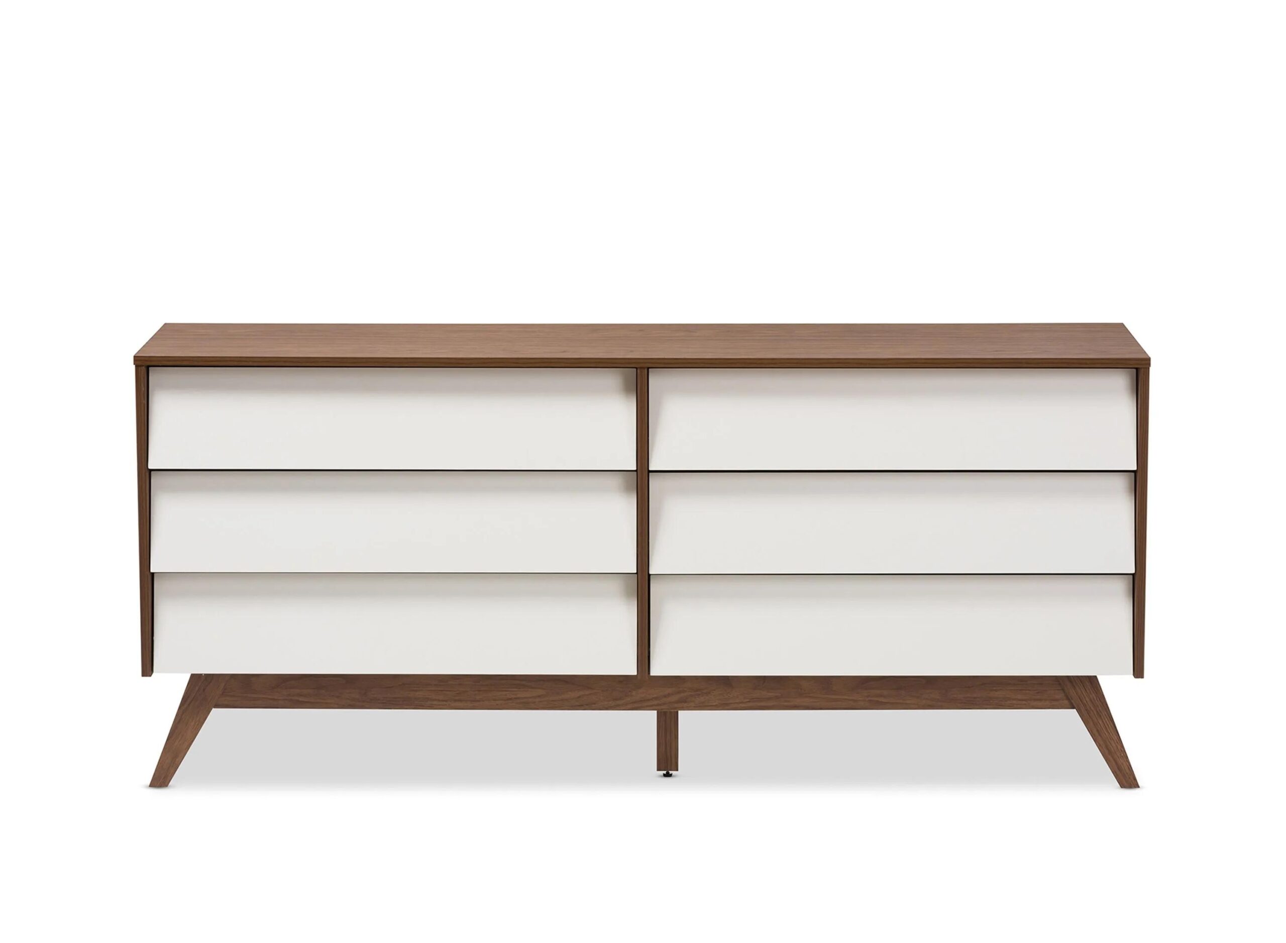 Featuring two-tone finishing in walnut and white, the Hildon wood 6-drawer storage dresser is a mid-century modern collection that will attract all of the attentions. The slanted design of the drawers gives it extra character and individual style while the splayed legs showcasing the retro modern
