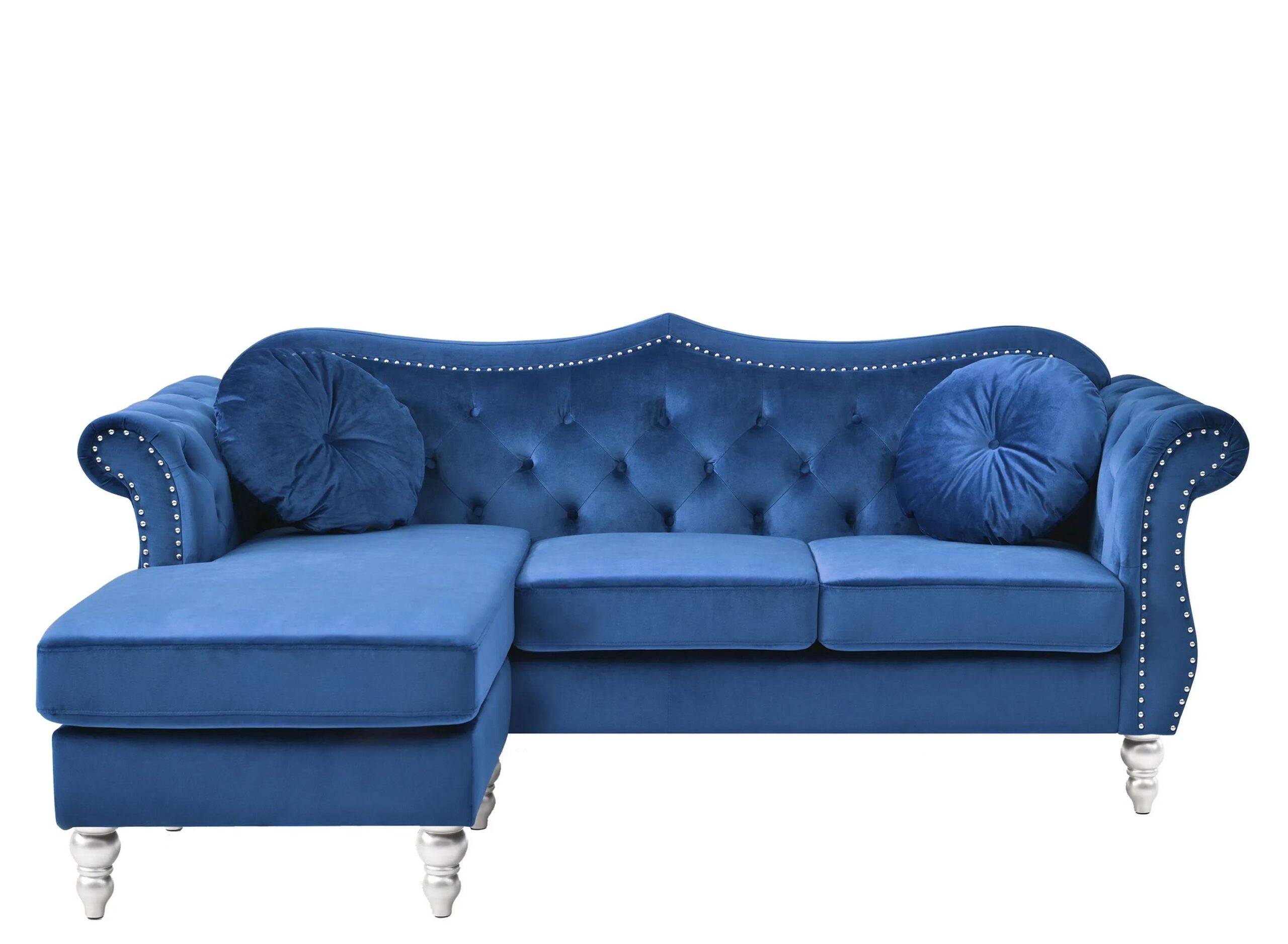 Hollywood sectional features an updated transitional look with tufted cover, hand applied nailheads, turned wood feet as well as two matching throw pillows. Chaise can be set up right or left facing.