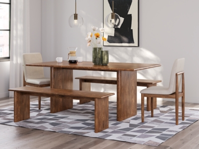 With its back-to-nature sensibility, this dining package is a natural fit for your well-edited space. A clean-lined design lets the beautifully organic quality and inherent luster of the wood shine through.