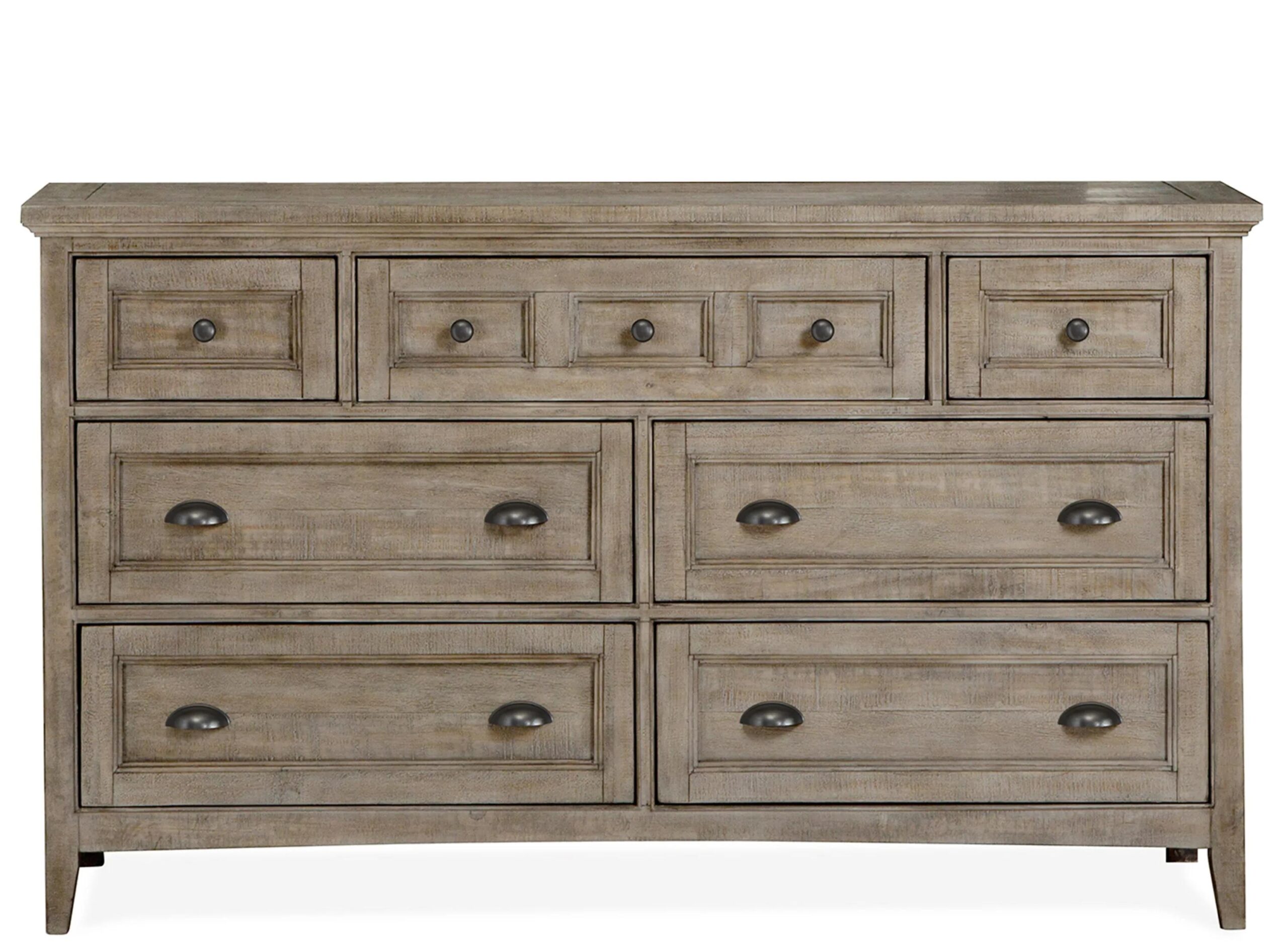 A soft dovetail gray finish on pine veneers and solids creates a relaxed beachy feel in any bedroom with Ivy Ridge Dresser. It lends shaker appeal and provides storage. Straight legs support the straight-lined dresser with raised beaded trim for a touch of cottage style.