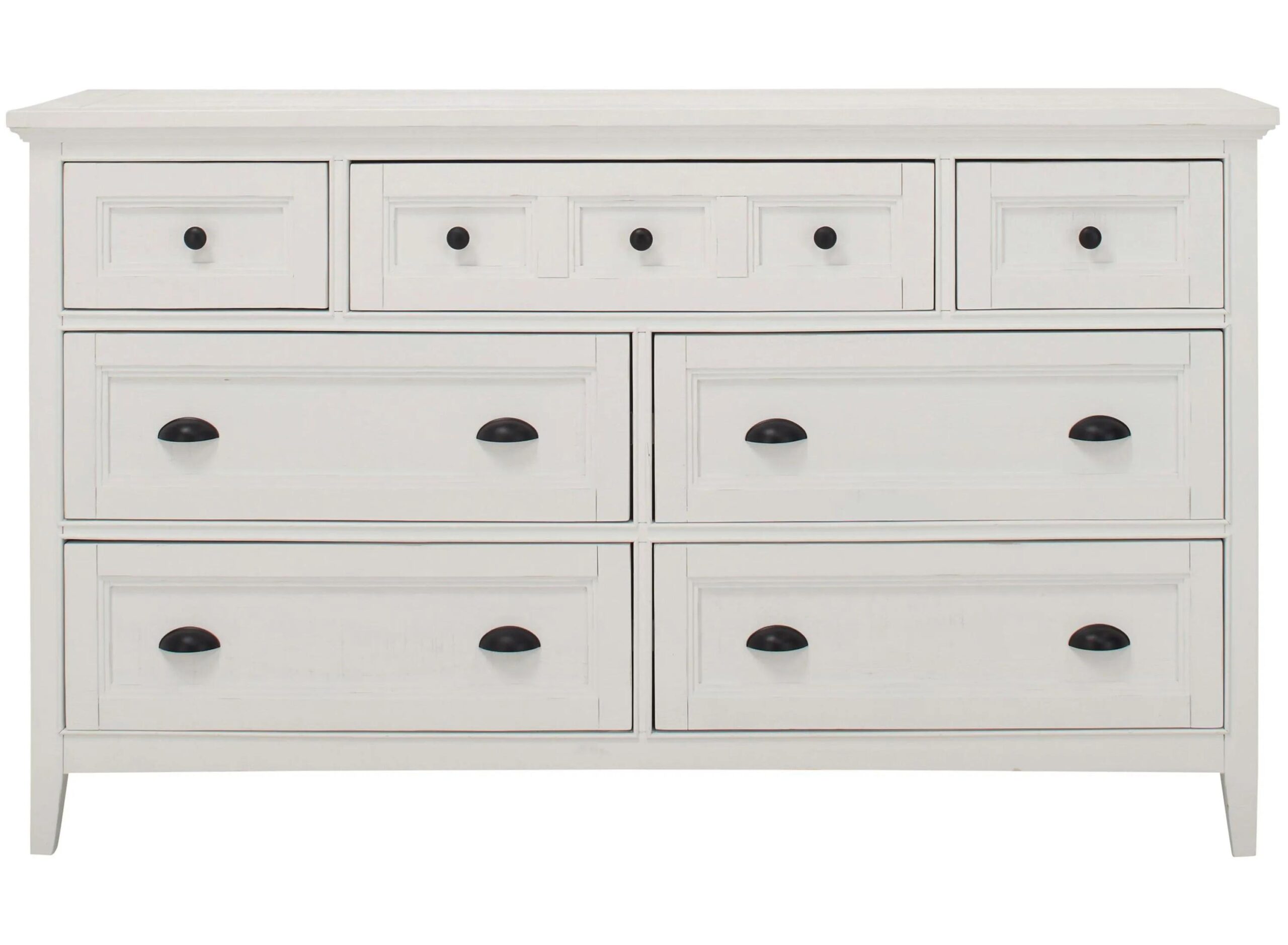A soft chalk white finish on pine veneers and solids creates a relaxed beachy feel in any bedroom with Ivy Ridge Dresser. It lends shaker appeal and provides storage. Straight legs support the straight-lined dresser with raised beaded trim for a touch of cottage style.