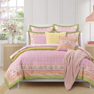 Bring vibrant charm to your bedroom with the Comforter Set. Designed with a delightful floral and geometric print, this set is crafted from silky microfiber to keep you cozy without feeling heavy. The lively mix of pinks, greens, and oranges is beautifully framed by a contrasting green border, ad