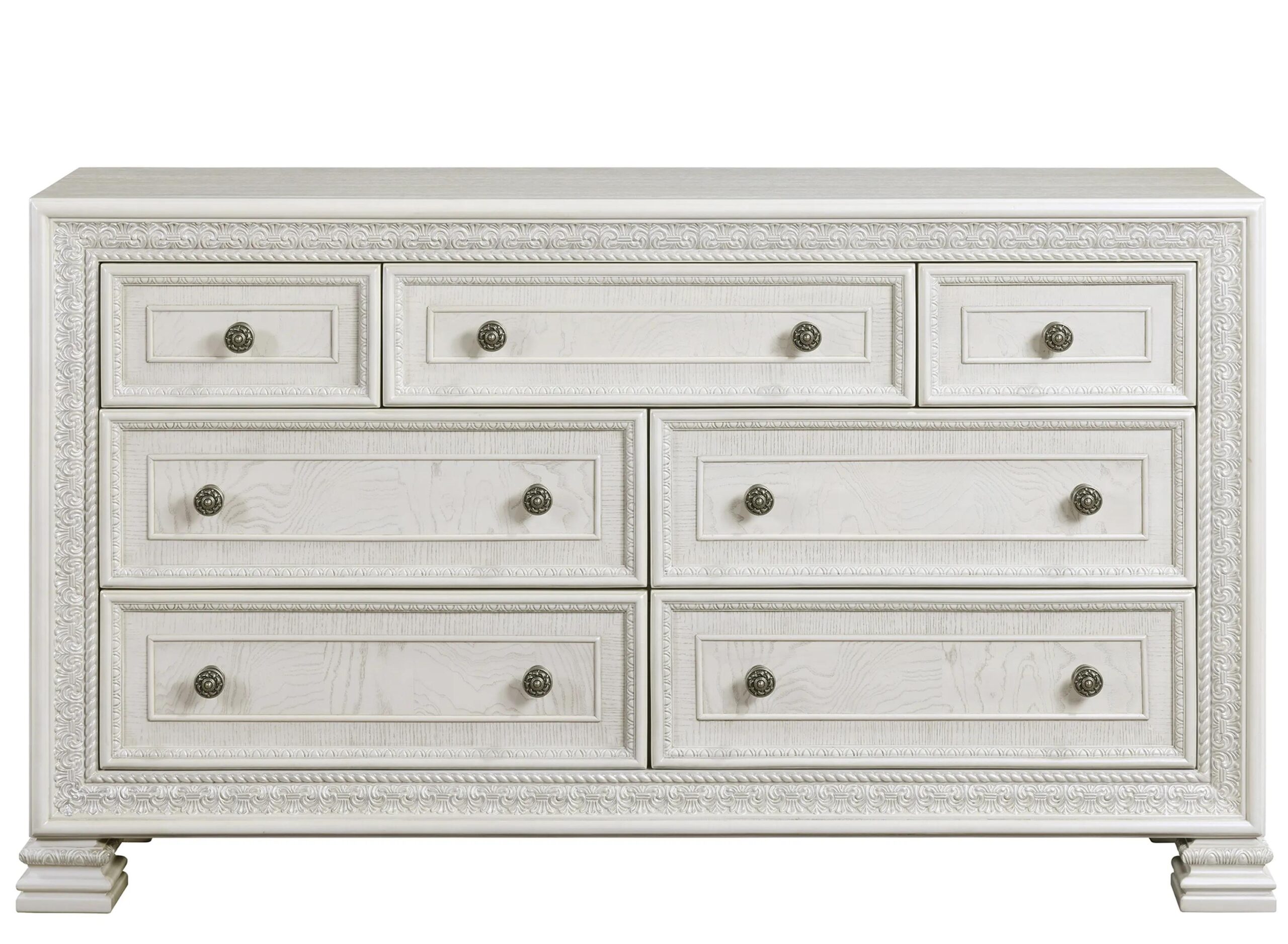 Modern Classicism is defined in the elegant presentation of the Jasper Dresser. The treasured themes of old-world accenting – egg and dart molding, acanthus detailing, rope molding, detailed knob hardware – front the dresser, mirror, chest, nightstand, and bed, their timeless style en