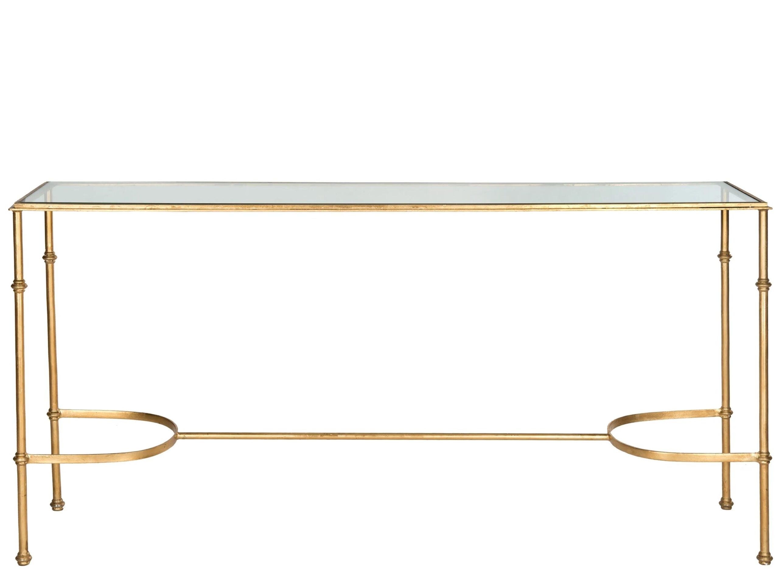 Inspired by couture jewelry, the Jett console table exudes understated elegance. Its tempered glass top adds an open airy look to any room, and its beautifully detailed iron base is timeless with its artful finish.