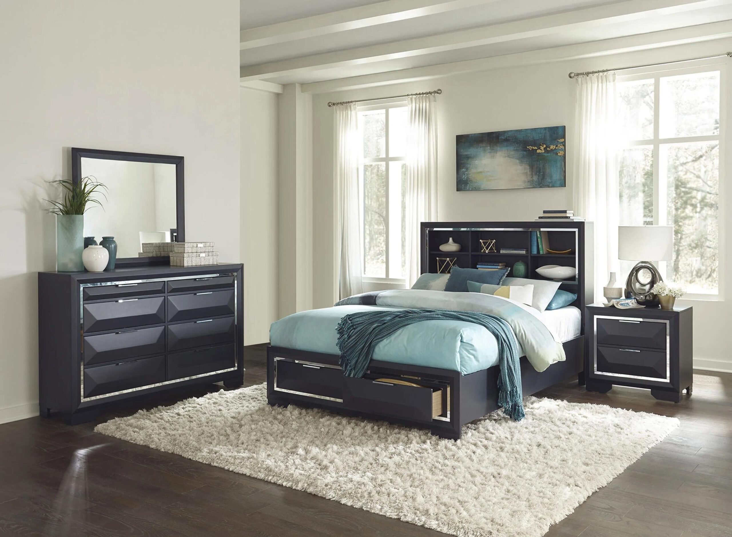 The modern design of the Jocelyn Bedroom Set creates a striking profile for your bedroom. The midnight blue finish is reflected by the chrome banding that defines the front of the bed. The hidden bookcase headboard and storage footboard proved additional functional storage space beyond a traditio