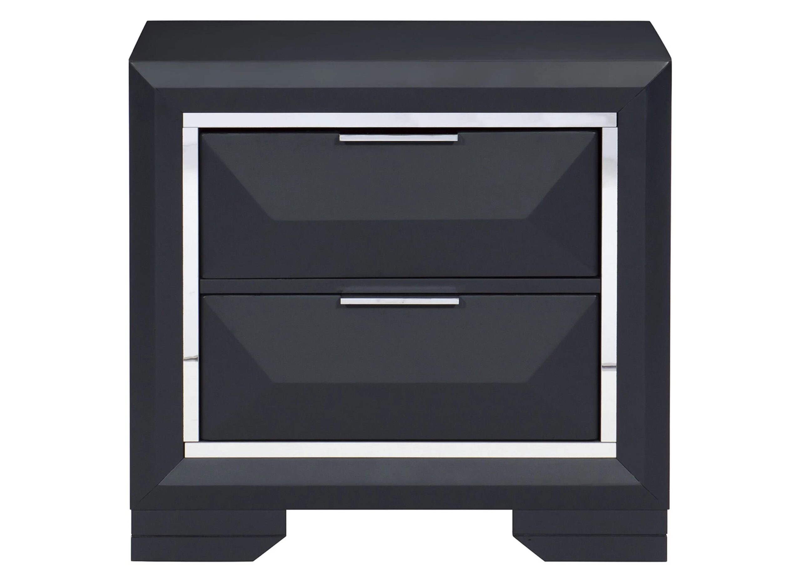 The modern design of the Jocelyn Nightstand creates a striking profile for your bedroom. The midnight blue finish is reflected by the chrome banding that defines the front of the nightstand. Chrome pull hardware accents each of the raised drawer fronts.