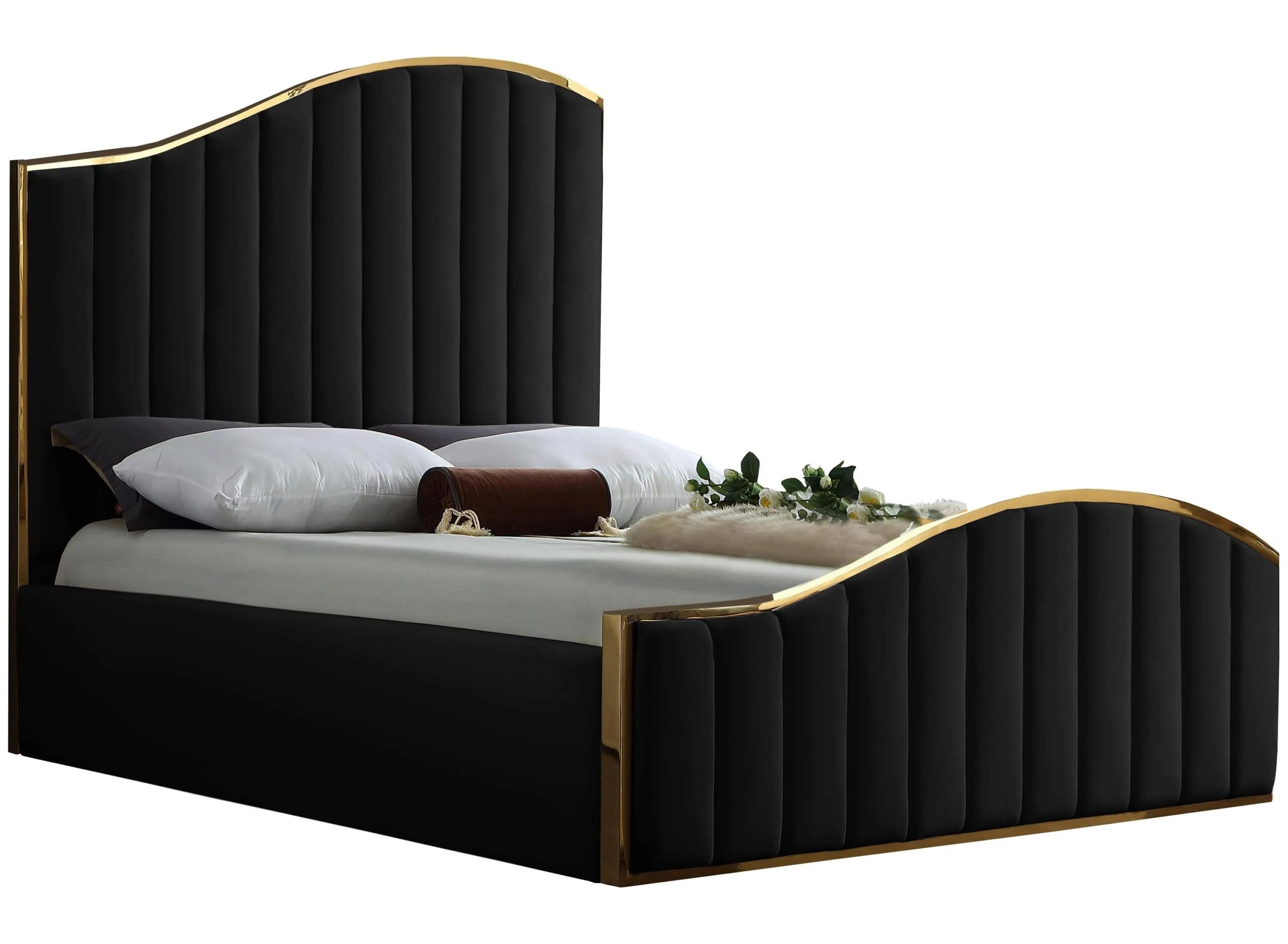 Transform your bedroom into a dream haven with the breathtaking Jolie Bed. Featuring a stunning polished gold metal frame that supports velvet upholstery on the headboard and footboard with channel tufting for texture, this sleek bed not only commands your attention, it demands it.