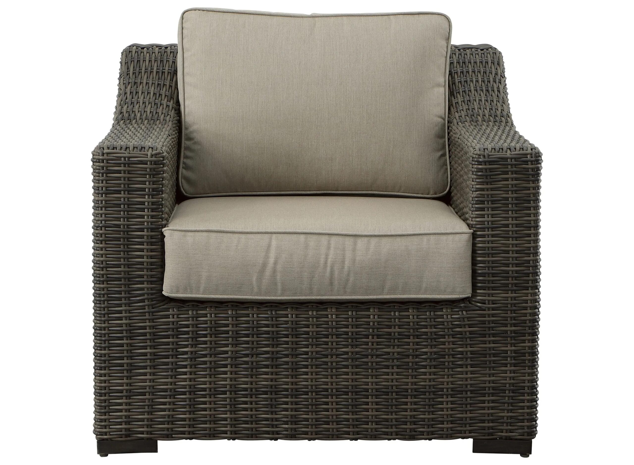 Jones Outdoor Chair features extra thick cushioning with an ultra-plush seat for relaxing and enjoying the view in luxurious comfort. Gently sloped arms and a combination of beige seating and brown wicker give this set a transitional look perfect for the great outdoors.