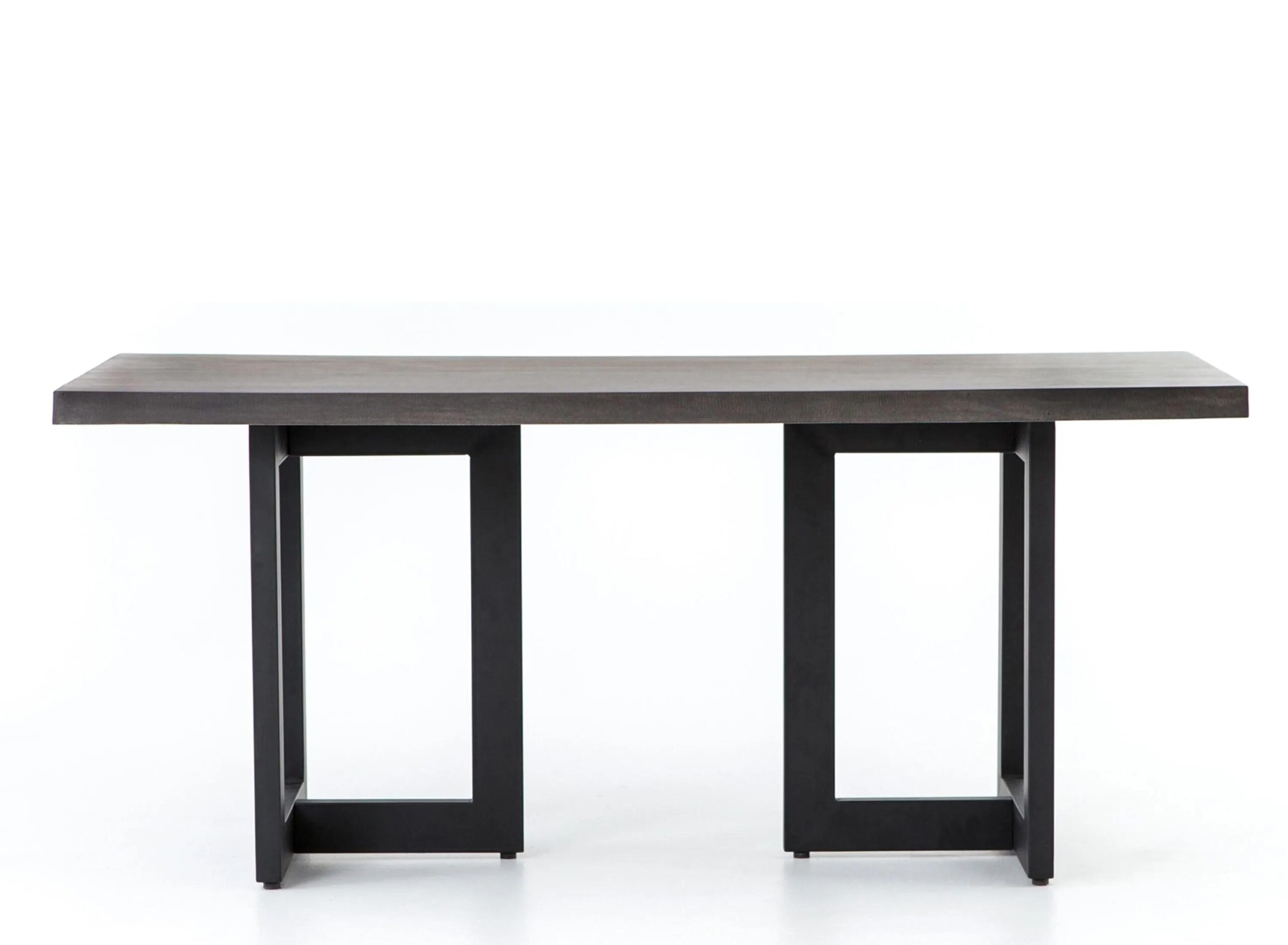 A black-finished iron base supports a rectangular tabletop of black lava stone, spurring an angular look with industrial appeal with the Judith outdoor dining table. Cover or store indoors during inclement weather and when not in use.