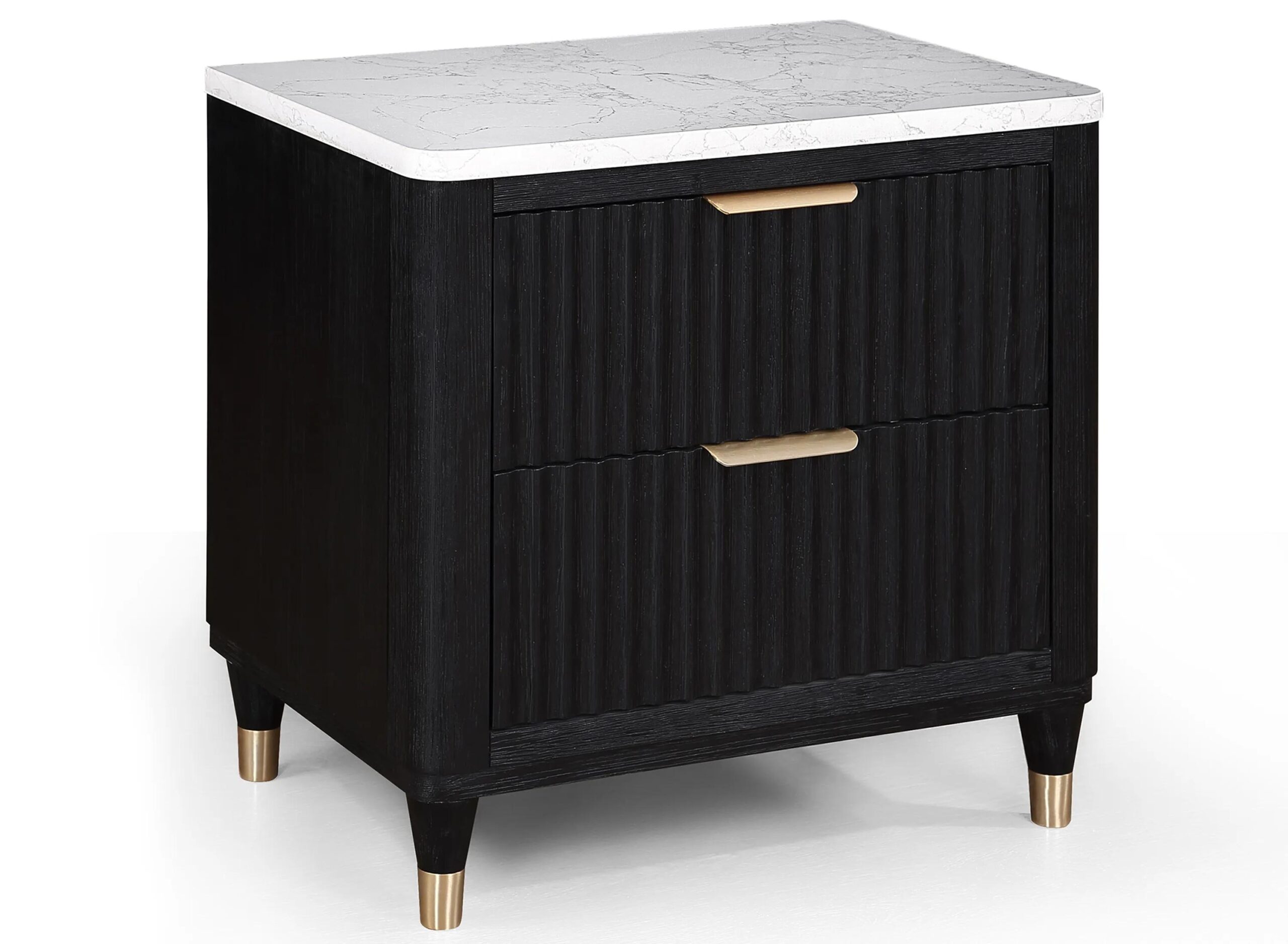 Elevate your sanctuary with this chic and contemporary Kara Nightstand that blends functionality with a sleek, modern aesthetic. The nightstand features a minimalist design with crisp engineered stone tops and bold, brass-accented hardware.