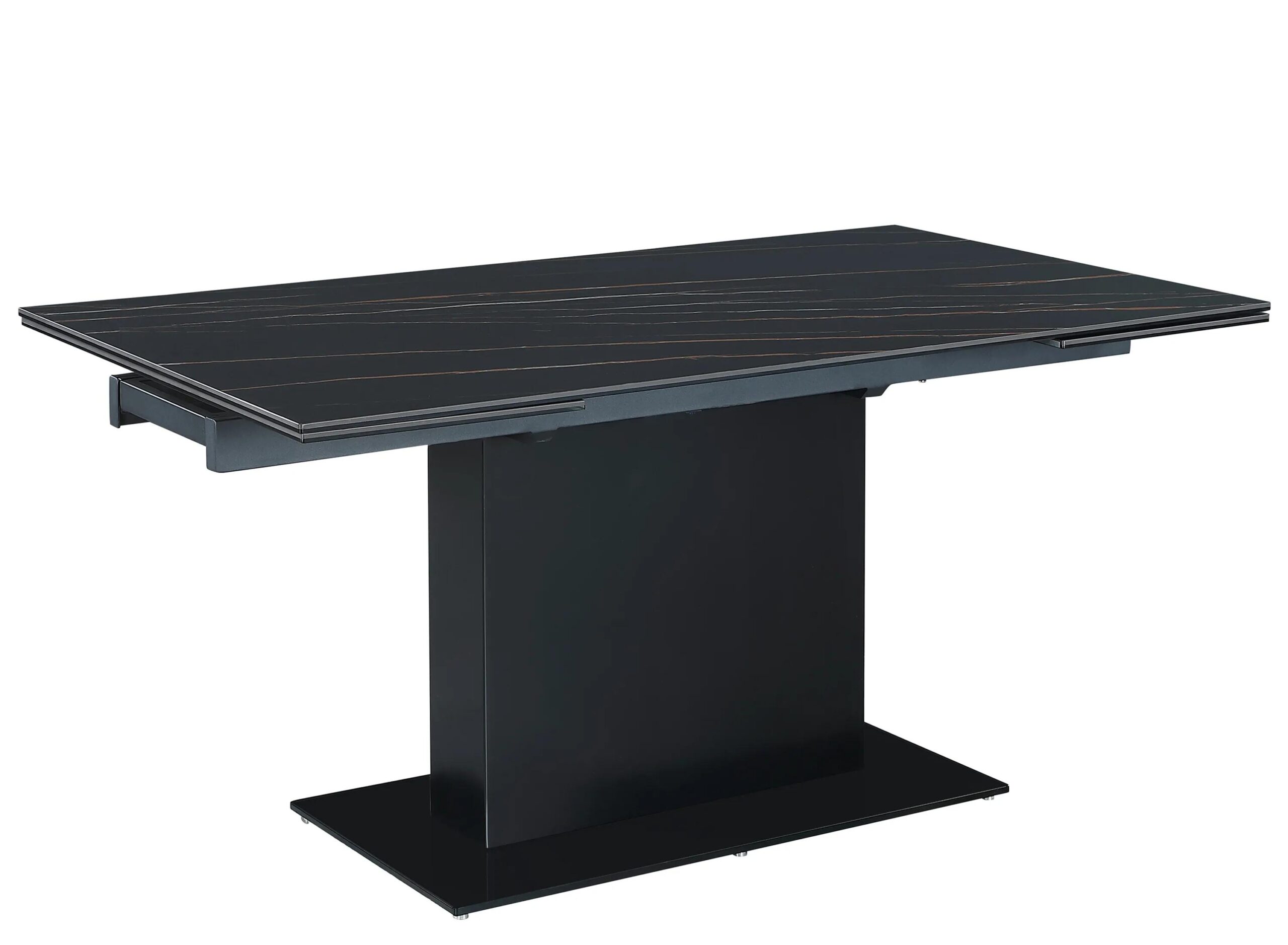 Elevate the dining area with this contemporary table. Gather around this extendable marbleized sintered stone tabletop in a matte black finish, set atop a wooden straight pedestal base in a timeless matte black finish.