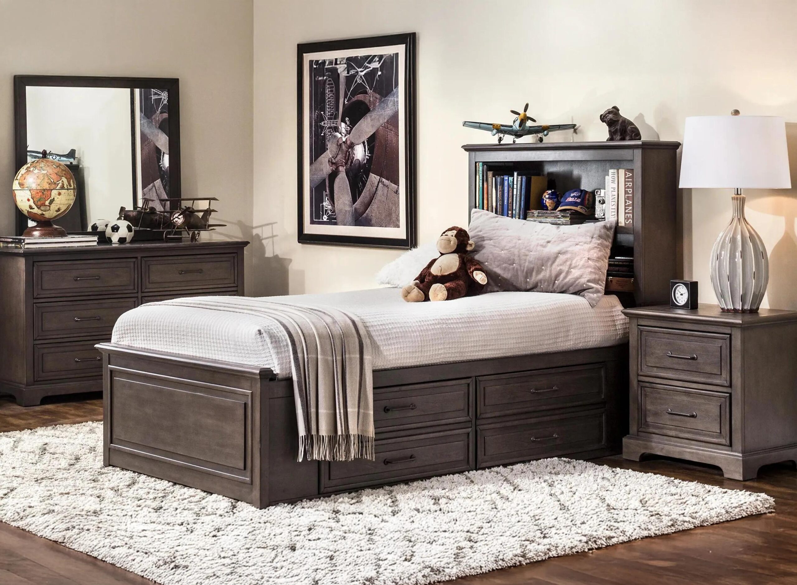 Whether you’re furnishing a guest room or your kid’s room, the Kieran 4-pc. Bedroom Set with 1-Side Storage will make a lasting impression. Its driftwood gray wood finish is dark and bold, but still maintains a touch of casual charm, and the headboard offers additional storage.