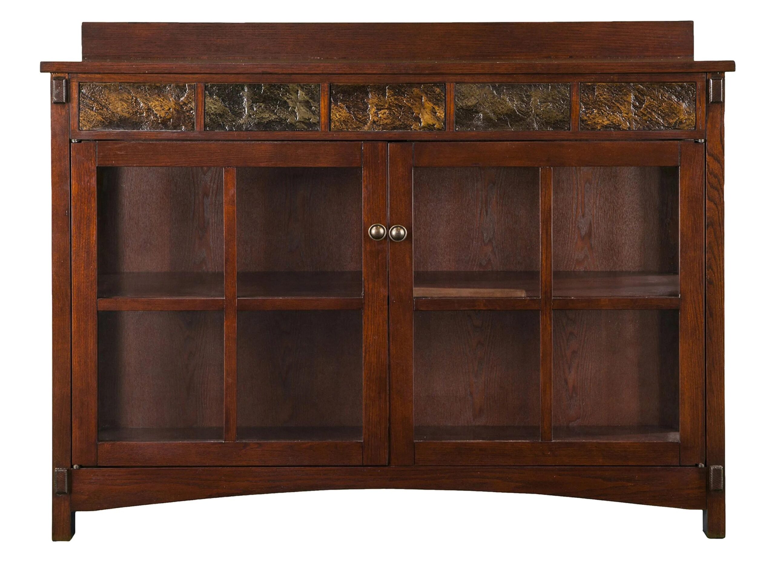 Multifunction rules the roost with this Kingsbridge Sideboard Curio table. Ruddy espresso and earth toned faux slate highlight a rustic twist on mission style. Windowpane glass cabinet doors and sides offer peek-a-boo storage of everything from entertaining essentials to extra linens, video games
