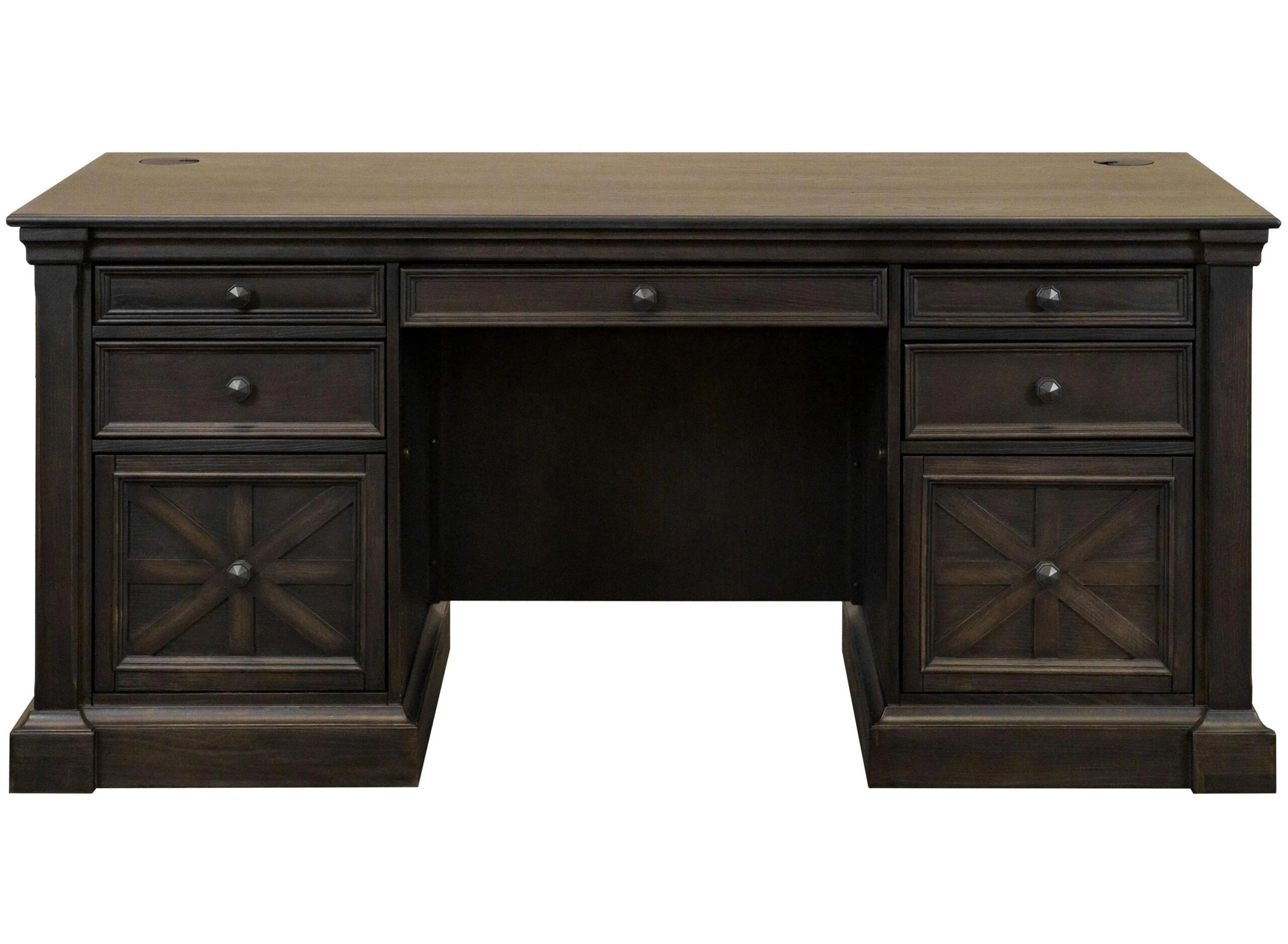 Kingston emanates an air of an English country manor. Dark chocolate rub through finish is softly worn to enhance the wood and give a naturally aged look to the collection. Criss-cross detail adds interest and dimension to drawer fronts and panels, while mottled antique hardware enhance the look