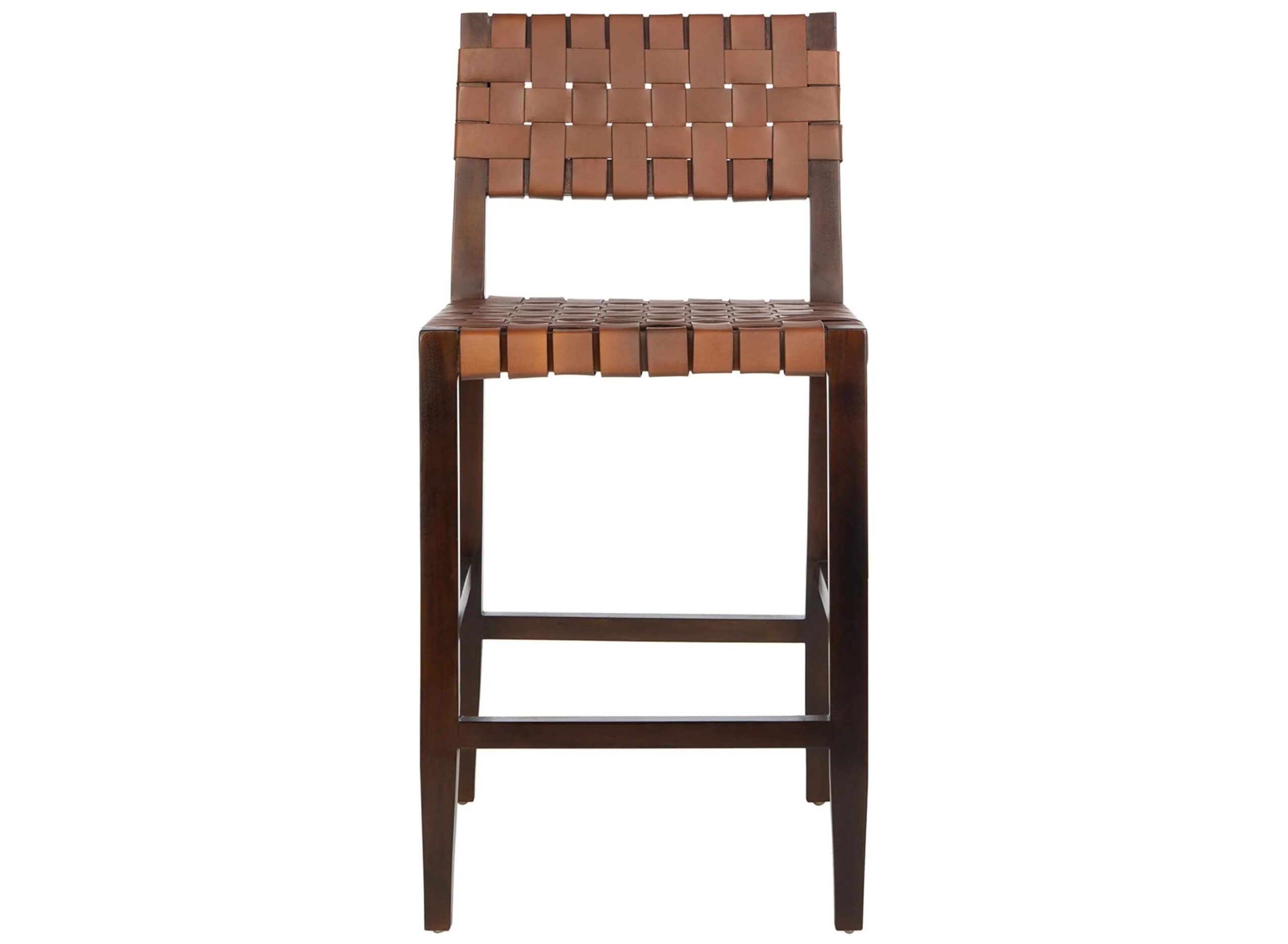 This contemporary woven leather counter stool brings modern luxury to any open plan living space or kitchen. Crafted with classic cognac leather, its mahogany wood features a beautiful walnut finish for a timeless design.