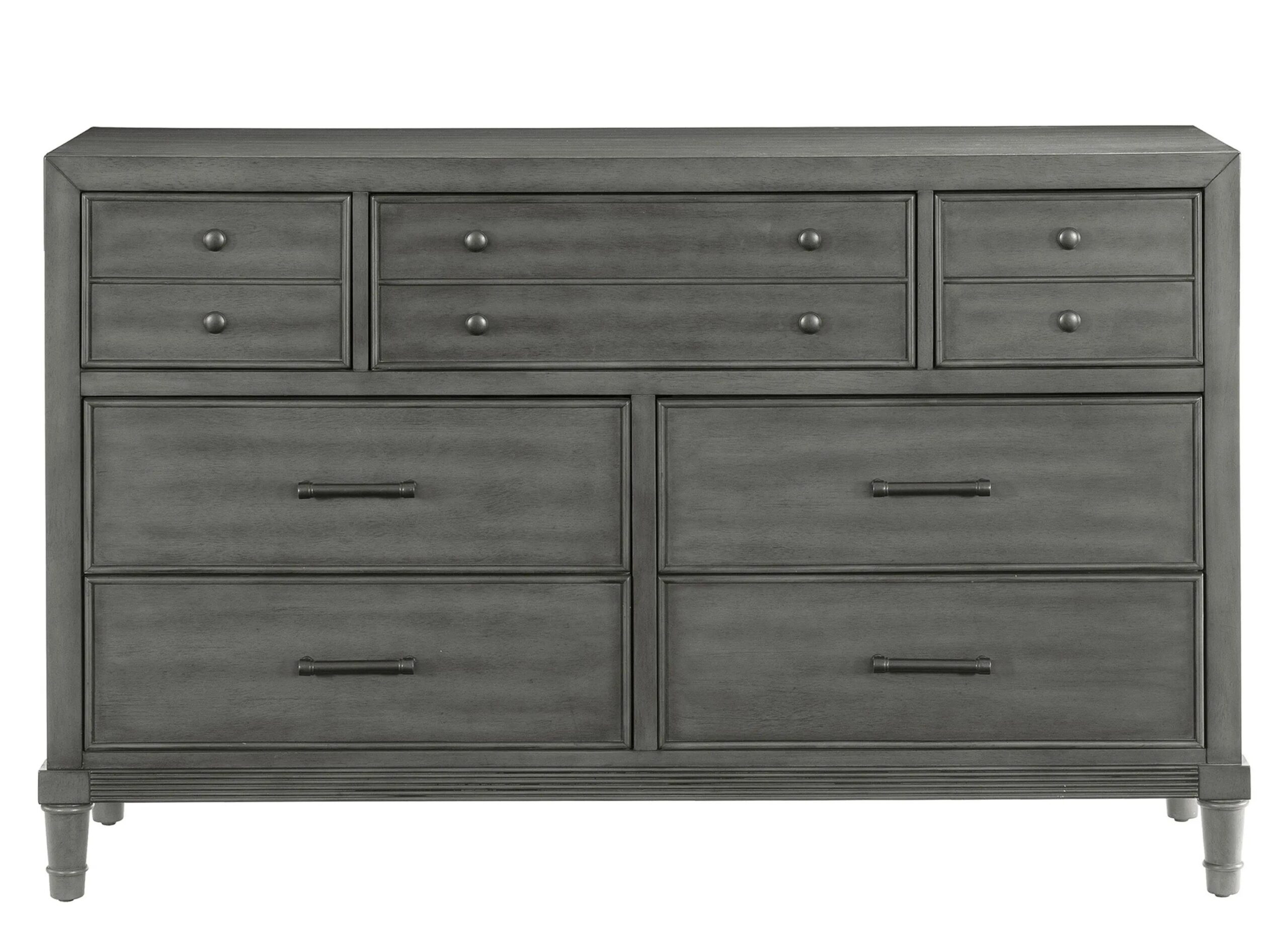 Modern convenience is paired with transitional style to create the versatile look of the Lana Dresser. The dresser’s gray finish over okume veneer is complemented by the dark bronze finished knob and bar hardware that fronts the framed drawers of the piece.