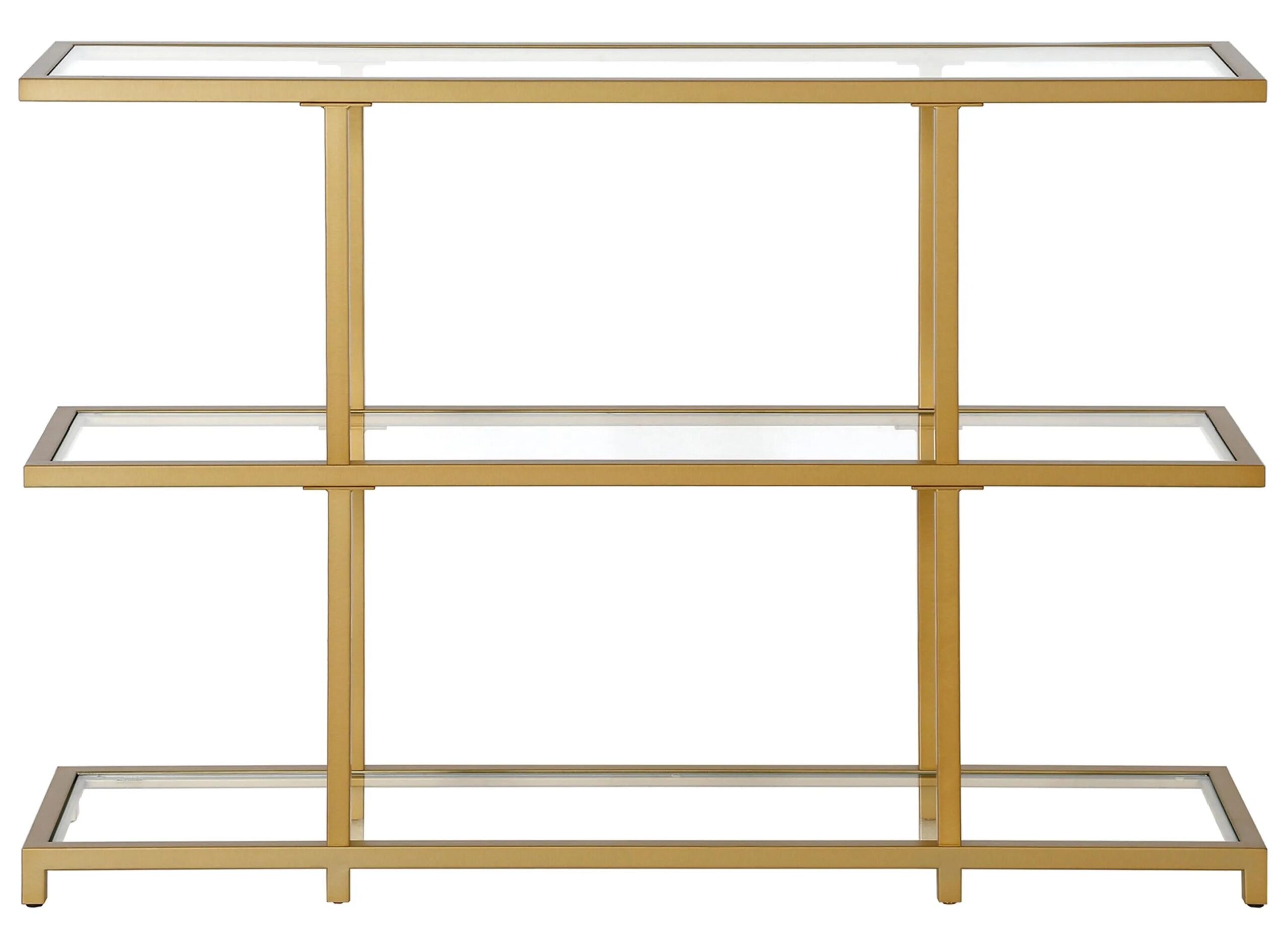 A bold linear profile sets this modern contemporary Lanabrook Console Table apart. Its inset frame echoes the cantilevered design of mid-century architecture, while the durable tempered glass shelves create an artful backdrop for framed photos, flowers, or your favorite collections of decorative