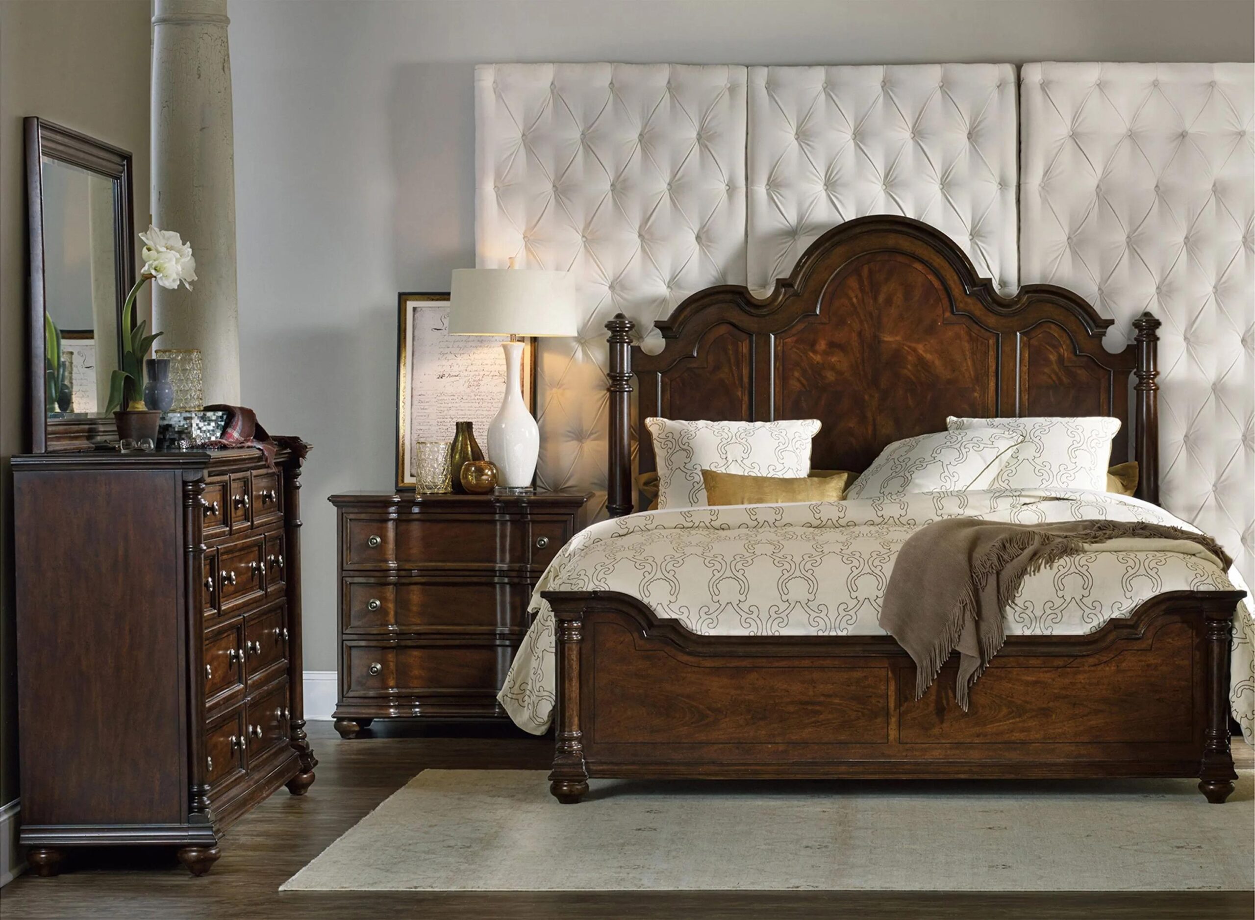 The striking, heirloom-quality Leesburg Poster Bedroom Set is elegantly shaped and displays exquisite swirl and cathedral mahogany veneers on the generously-scaled headboard. Crafted of Mahogany Veneers, the bed features a rich traditional mahogany finish with exquisite cathedral and swirl mahoga